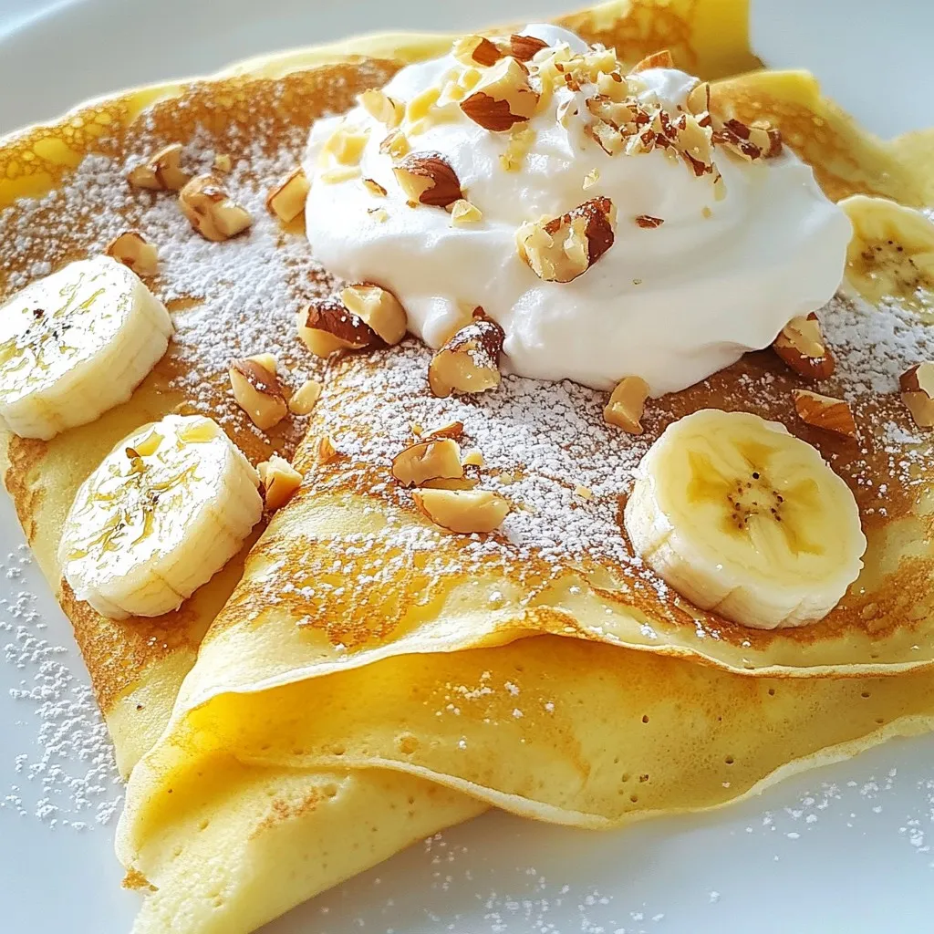 - 1 cup all-purpose flour - 2 large eggs - 1 1/4 cups milk - 2 tablespoons melted butter - 1 tablespoon sugar - 1/2 teaspoon vanilla extract - 2 ripe bananas, sliced - 1/2 cup Nutella - Whipped cream (optional, for serving) - Chopped hazelnuts (optional, for garnish) To make these Banana Nutella crepes, gather all the ingredients first. Using good quality flour makes a difference. I like to use all-purpose flour for its lightness. Eggs help bind the crepes and give them a nice texture. You need large eggs for the best results. Milk is key for a smooth batter. I prefer whole milk, but any milk works. Melted butter adds flavor and keeps the crepes from sticking. A little sugar sweetens the batter without making it too sweet. Vanilla extract brings out the flavors nicely. Use ripe bananas for the best taste and texture. Nutella adds a rich, creamy layer that makes these crepes special. Feel free to add whipped cream or chopped hazelnuts on top for extra flavor and crunch. These optional toppings can elevate your crepes. Now that you have all the ingredients, you're ready to create a delightful dish that everyone will love! {{ingredient_image_1}} To start, I mix the dry ingredients in a bowl. I add 1 cup of all-purpose flour, 1 tablespoon of sugar, and a pinch of salt. Then, I make a well in the center. This well helps the wet ingredients blend better. Next, I combine the wet ingredients in another bowl. I whisk together 2 large eggs, 1 1/4 cups of milk, 2 tablespoons of melted butter, and 1/2 teaspoon of vanilla extract. I mix until the mixture is smooth. Now, I pour the wet mix into the well of the dry mix. I whisk gently until the batter is smooth and lump-free. It is important to let the batter rest for 30 minutes at room temperature. This step helps the crepes turn out light and tender. I heat a non-stick skillet over medium heat. I lightly grease it with butter to help prevent sticking. Then, I pour about 1/4 cup of the batter into the skillet. I swirl the pan to coat the base evenly. I cook the crepe for about 2 minutes. I look for the edges to lift and the bottom to be golden. Then, I flip the crepe and cook for another minute. I repeat this with the remaining batter and stack the finished crepes on a plate. Now comes the fun part! I take a crepe and spread Nutella on one half. I use about 1/2 cup of Nutella for all the crepes. Then, I add sliced bananas on top. I like to use 2 ripe bananas for a sweet touch. To fold, I take the crepe and fold it in half. Then, I fold it in half again to create a triangle. I serve the crepes warm. For extra flair, I sometimes top them with whipped cream and chopped hazelnuts. Enjoy your delicious treat! To make the best crepes, you need to let your batter rest. This step helps the gluten relax, leading to a tender, smooth texture. I suggest resting the batter for at least 30 minutes. This gives it time to hydrate and thicken slightly. To prevent sticking, use a non-stick skillet. Heat it over medium heat and lightly grease it with butter. Make sure the pan is hot before pouring in the batter. This helps create a nice, even surface. Get creative with your toppings! Besides Nutella and bananas, you can try strawberries or raspberries. A drizzle of honey or maple syrup adds sweetness. For a crunchy twist, sprinkle chopped hazelnuts or almonds on top. Pair your crepes with a scoop of vanilla ice cream or a dollop of whipped cream. These options make each bite even more delightful. If you have leftover crepes, stack them with parchment paper in between. This prevents them from sticking together. Store them in an airtight container in the fridge for up to three days. To reheat, place a crepe in a warm skillet for about 30 seconds on each side. This keeps them soft and flavorful. Avoid using a microwave, as it can make them tough. Pro Tips Let the Batter Rest: Allowing the crepe batter to rest for at least 30 minutes helps the gluten relax, resulting in tender and flexible crepes. Control the Heat: Keeping the skillet at medium heat ensures even cooking and prevents the crepes from browning too quickly. Adjust the heat as necessary. Use a Non-Stick Skillet: A non-stick skillet is ideal for crepes as it allows for easy flipping and reduces the need for excess butter. Customize Your Fillings: Feel free to get creative with fillings! Other fruits, such as strawberries or raspberries, can be delicious alternatives to bananas. {{image_2}} You can switch Nutella for other tasty spreads. Try peanut butter for a nutty twist. Almond butter adds a rich flavor. Sunflower seed butter is great for nut-free diets. Flavor-infused spreads can make your crepes unique. Look for chocolate hazelnut spreads with different spices. You can also use fruit preserves like raspberry or strawberry for a fruity kick. While bananas are classic, other fruits work well too. Sliced strawberries add a bright, fresh taste. Blueberries bring a sweet burst in every bite. Try mixing fruits for more flavor. Seasonal fruits can also change your crepe game. In summer, use peaches or cherries. Fall is perfect for apples and pears. Use whatever is fresh and in season for the best taste. You can make these crepes gluten-free easily. Swap all-purpose flour for a gluten-free blend. Look for a mix that includes xanthan gum for better texture. To keep the crepes soft, add a bit more liquid if needed. This helps maintain a good flavor and feel. Experiment with almond flour for a nutty flavor. Remember, the right flour can make a big difference! You can make crepes without eggs using substitutes. Here are some options: - Flaxseed meal: Mix one tablespoon of flaxseed meal with three tablespoons of water. Let it sit for a few minutes until it thickens. - Chia seeds: Use one tablespoon of chia seeds mixed with three tablespoons of water. This also thickens nicely. - Applesauce: A quarter cup of unsweetened applesauce can replace one egg. It adds moisture and sweetness. - Silken tofu: Blend one quarter cup of 