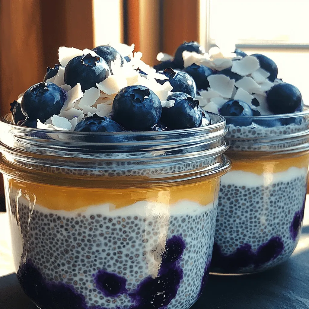 After chilling, stir the pudding well. If it feels too thick, add a splash of coconut milk to reach your ideal texture. Now, it’s time to serve! Layer the chia pudding in bowls with fresh blueberries and a sprinkle of shredded coconut. This makes it look great and adds flavor. Top with more blueberries and coconut flakes. Now it’s ready to enjoy!