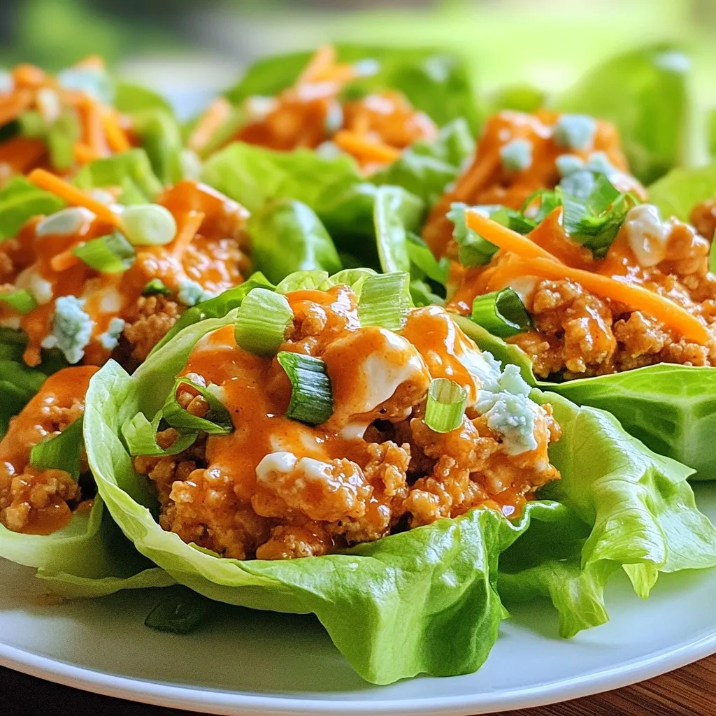 To make Buffalo Chicken Lettuce Wraps, you need a few simple ingredients. Here is the list: - 1 pound ground chicken - 1 tablespoon olive oil - 1/2 cup buffalo sauce (choose mild or spicy) - 1/4 cup cream cheese, softened - 1/2 cup shredded carrots - 1/4 cup blue cheese crumbles (optional) - 1/4 cup chopped green onions - 1 head of iceberg or butter lettuce, separated into leaves - Salt and pepper to taste Each ingredient plays a key role in the flavor and texture of the wraps. Ground chicken gives a lean protein base. Olive oil helps cook the chicken nicely. Buffalo sauce adds that spicy kick everyone loves. Cream cheese makes the mixture creamy and rich. Shredded carrots add crunch and color. Green onions bring freshness. You can add blue cheese crumbles for a tangy twist. Finally, the lettuce leaves serve as the perfect wrap. These ingredients come together to create a tasty and easy meal. You can adjust the buffalo sauce to fit your spice level. Enjoy crafting these wraps for a fun dinner or a quick lunch! {{ingredient_image_1}} To start, heat 1 tablespoon of olive oil in a large skillet over medium heat. Once the oil is hot, add 1 pound of ground chicken. Cook it for about 6 to 8 minutes until it turns brown and is fully cooked. Make sure to stir it often. Next, drain any extra fat from the skillet. Then, add 1/2 cup of buffalo sauce to the chicken. You can choose mild or spicy sauce based on your taste. Stir in 1/4 cup of softened cream cheese. Cook this mixture for another 2 to 3 minutes. Keep stirring until the cream cheese melts and mixes well with the chicken. Now it's time to add flavor! Mix in 1/2 cup of shredded carrots. Season your filling with salt and pepper to taste. Cook everything for another minute. This will heat the carrots and blend the flavors. While the mixture cools a bit, prepare your lettuce leaves. Use a head of iceberg or butter lettuce. Carefully separate the leaves. You want them to be big enough to hold the filling. To serve, take a lettuce leaf and spoon in a generous amount of your buffalo chicken mixture. Wrap it up like a taco and take a big bite. For extra flavor, you can add blue cheese crumbles on top. I recommend serving these wraps with ranch or blue cheese dressing for dipping. These sauces add a creamy touch that balances the heat from the buffalo sauce. Enjoy your delicious and easy meal! Cooking ground chicken well is key. It ensures the meat is safe to eat. Aim for a nice golden-brown color. This shows it is fully cooked. When adding cream cheese, soften it first. This makes it easier to mix in. I like to cut it into small pieces. This helps it melt faster when you stir it in. For a great presentation, use large lettuce leaves. They hold the filling well. Arrange the wraps on a platter for easy access. Pair these wraps with fresh veggies or a light salad. Carrot sticks and celery complement the flavors. You can also serve them with a ranch dip. Buffalo chicken wraps have many health benefits. Ground chicken is high in protein. It helps build muscles and keeps you full. The carrots add vitamins and fiber. Blue cheese crumbles can enhance taste but add calories. Each wrap is about 250 calories. Check your serving size for precise counts. Pro Tips Use Fresh Lettuce: Choose crisp, fresh lettuce leaves for the best texture and flavor. Iceberg and butter lettuce are great options for wrapping. Customize the Heat: Adjust the level of buffalo sauce according to your heat preference. Start with a mild sauce and add more if you like it spicy. Make it Ahead: You can prepare the buffalo chicken mixture in advance and store it in the fridge. Just reheat before serving for a quick meal. Add More Veggies: Feel free to add other veggies like diced celery or bell peppers to the chicken mixture for extra crunch and flavor. {{image_2}} You can make Buffalo chicken lettuce wraps vegetarian. Use plant-based ground meat for a tasty swap. Some great choices are lentils or crumbled tofu. For the sauce, try a mix of BBQ sauce and hot sauce. This gives a great flavor kick without meat. Want more heat? Add extra buffalo sauce to your chicken mix. You can also sprinkle in some cayenne pepper or red pepper flakes. These spices boost the heat and add depth. For extra flavor, mix in diced jalapeños or hot sauce to the filling. Feel free to get creative with your filling! Add diced bell peppers or corn for a sweet crunch. You can also use different types of lettuce. Butter lettuce adds a soft touch, while Romaine gives a nice crunch. Explore these swaps to find your favorite flavor combos. To keep your Buffalo Chicken Lettuce Wraps fresh, store them in the fridge. Place the chicken mixture in an airtight container. This helps keep moisture in and air out. The wraps can stay fresh for about three to four days. Keep the lettuce separate to avoid sogginess. Use a Ziplock bag or another container for the lettuce leaves. When you want to enjoy leftovers, reheat the chicken mixture on the stove. Use low heat and stir often for even warming. You can also use a microwave. Heat in short bursts, stirring in between. This helps keep the chicken moist. Avoid reheating the lettuce; it’s best fresh. Yes, you can freeze the chicken mixture, but not the lettuce. To freeze, place the cooled chicken in an airtight container. Label it with the date for easy tracking. Frozen, it lasts up to three months. To thaw, move it to the fridge overnight. Reheat it on the stove or microwave before serving. This way, you can enjoy a quick meal anytime! To add more heat to your Buffalo Chicken Lettuce Wraps, you can try several easy tips: - Use a hotter buffalo sauce. - Add diced jalapeños to the chicken mixture. - Mix in crushed red pepper flakes. - Top with a spicy ranch or blue cheese dressing. These options let you control the heat to match your taste. Yes, you can use other meats in this recipe. Here are some tasty alternatives: - Ground turkey for a lean option. - Shredded chicken for a differe