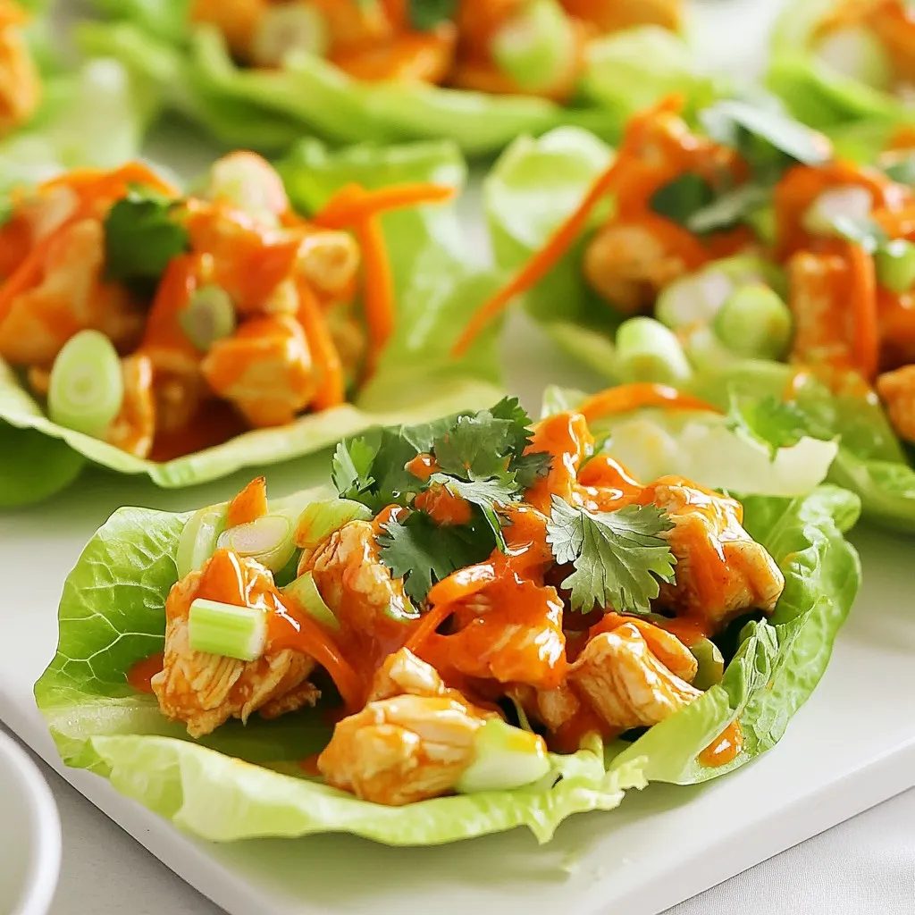 A spicy and healthy dish featuring buffalo chicken wrapped in fresh lettuce leaves.