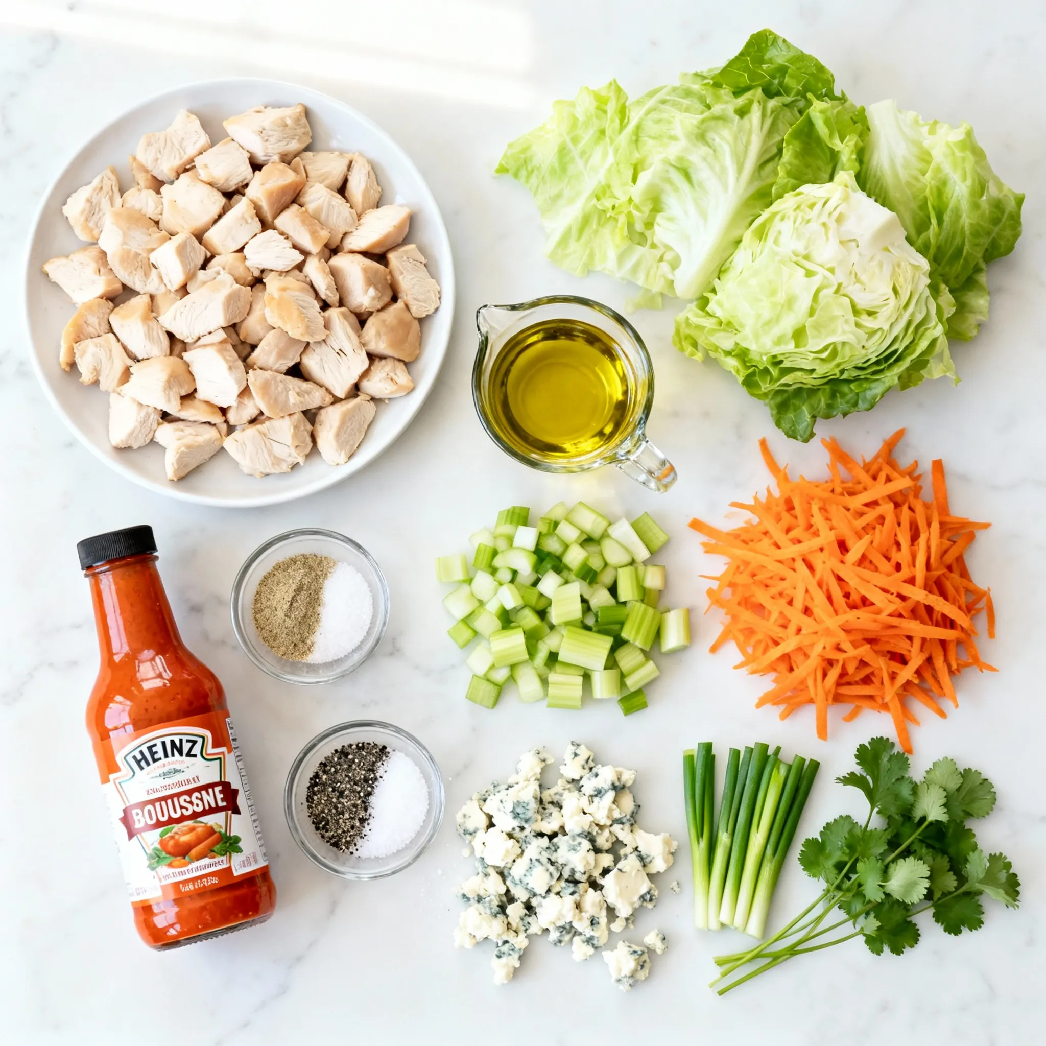 The main stars of our dish are the chicken, buffalo sauce, and olive oil. Diced chicken breasts give the wraps a great texture and flavor. The buffalo sauce adds that famous spicy kick. Olive oil helps cook the chicken and keeps it moist.