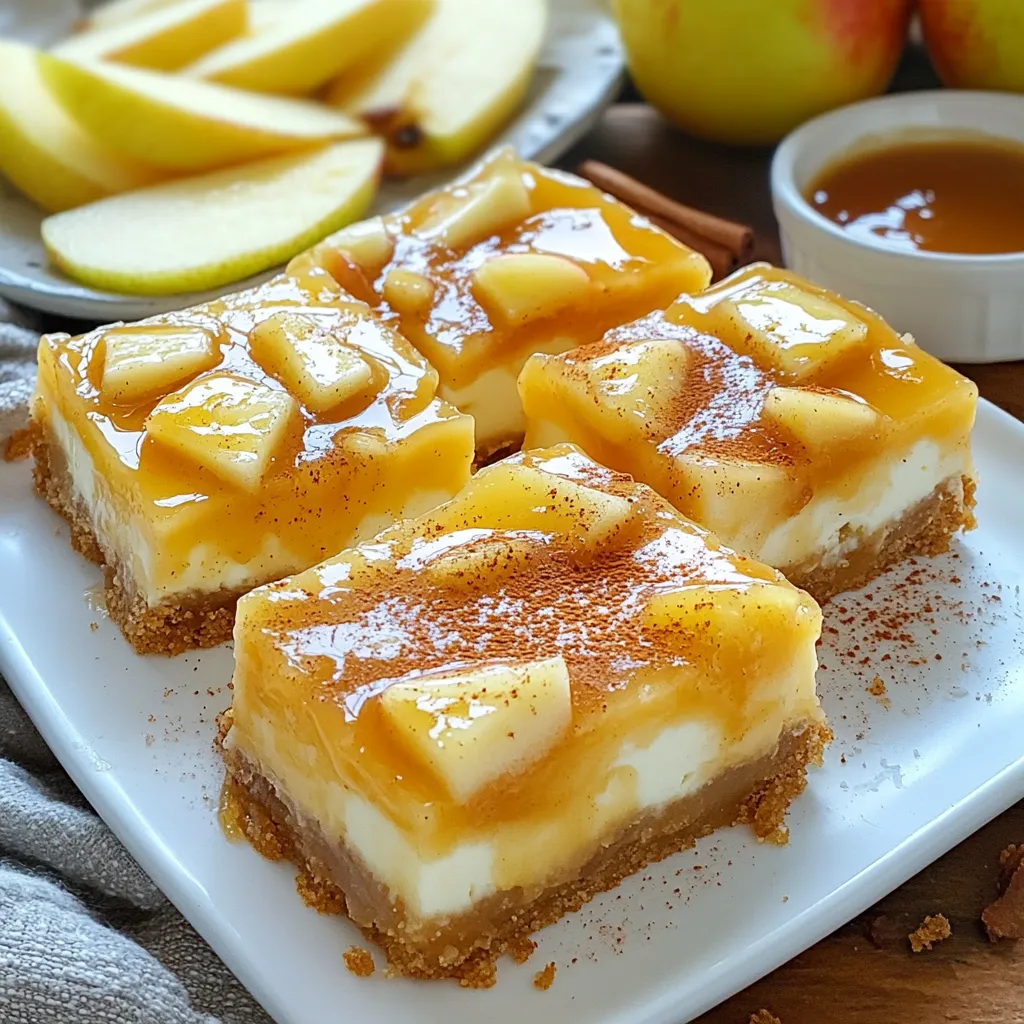 Delicious cheesecake bars with a caramel apple twist, perfect for fall.