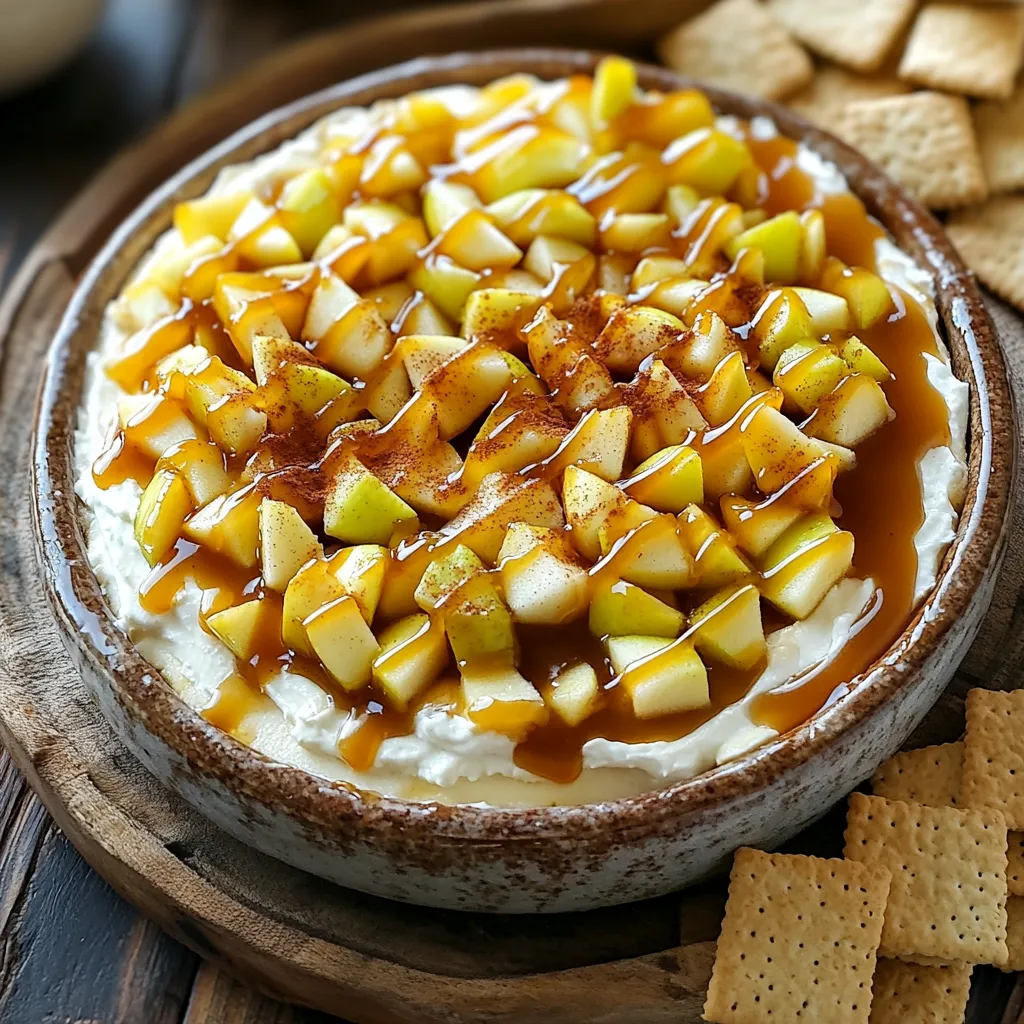 To make this tasty dip, gather these essential items: - 2 medium apples (Granny Smith or Honeycrisp), peeled, cored, and diced - 1 cup caramel sauce (store-bought or homemade) - 1 teaspoon lemon juice - 1 teaspoon ground cinnamon - ½ teaspoon ground nutmeg - 8 oz cream cheese, softened - ½ cup powdered sugar - 1 teaspoon vanilla extract - 1 cup whipped topping (or whipped cream) - Graham crackers, for serving These ingredients come together to create a sweet and creamy dip, perfect for sharing. You can add extra flavors to make it unique: - Chopped nuts (like pecans or walnuts) for crunch - A pinch of sea salt to enhance sweetness - A splash of maple syrup for a rich taste - Chocolate chips for a fun twist Feel free to mix and match these to suit your taste! For the best experience, serve your dip with: - Graham crackers for dipping - Sliced apples for a fresh crunch - Pretzels for a sweet and salty combo - Vanilla wafers for a classic touch These options make it fun to enjoy the dip in different ways! First, take the apples and peel them. I like to use Granny Smith or Honeycrisp apples for their crunch. Next, core the apples and dice them into small pieces. Once diced, place them in a medium bowl. Add one teaspoon of lemon juice to help keep them fresh. Now, sprinkle in one teaspoon of ground cinnamon and half a teaspoon of ground nutmeg. Toss the apples well to coat them with the spices. Set this bowl aside while you prepare the cream cheese mixture. In a large mixing bowl, start with eight ounces of softened cream cheese. It helps if the cream cheese is at room temperature. Using a hand mixer, beat it until it's smooth. Next, add half a cup of powdered sugar and one teaspoon of vanilla extract. Mix these together until they are creamy and well combined. Now, gently fold in one cup of whipped topping. This will make your dip light and fluffy. Make sure everything is mixed well. Grab a serving dish and layer the cream cheese mixture at the bottom. Spread it evenly across the dish. Next, spoon the apple mixture on top of the cream cheese layer. Make sure to distribute the apples evenly. Drizzle one cup of caramel sauce over the apples. You want to cover them nicely with the sweet sauce. If you like, you can add more whipped topping on top. To finish, sprinkle a little cinnamon for extra flavor. Serve this delightful dip with graham crackers for dipping. Enjoy the sweet and creamy mix! For this dip, I like using Granny Smith or Honeycrisp apples. These apples are crisp and have a nice balance of sweet and tart. This balance enhances the flavor of the dip. When picking apples, look for ones that are firm and bright in color. Avoid soft or bruised apples, as they may not taste good in your dip. To make the dip extra creamy, use softened cream cheese. This helps it blend well with the other ingredients. Beat the cream cheese and powdered sugar together until smooth. Make sure to fold in the whipped topping gently. This keeps the dip light and airy. If you want to add more creaminess, you can use extra whipped topping too. This dip is a great choice for parties! Serve it in a large bowl with graham crackers on the side. You can also add sliced apples or pretzels for variety. For a fun touch, drizzle extra caramel sauce over the top right before serving. Set out small plates or cups for easy sharing. Guests will love dipping and enjoying this sweet treat! {{image_2}} If you want to make a lighter version of caramel apple pie dip, consider these swaps: - Use Greek yogurt instead of cream cheese. - Replace caramel sauce with a fruit spread or pureed dates. - Choose low-fat whipped topping for fewer calories. These changes help lower fat and sugar while keeping flavor. You can add creativity to your dip with these flavor twists: - Mix in peanut butter for a nutty taste. - Add chocolate chips for a sweet surprise. - Try a splash of maple syrup for a warm flavor. Each option adds a unique touch to your dip. For a delightful crunch, consider these add-ins: - Chopped nuts, like pecans or walnuts, add great texture. - Toasted coconut flakes give a tropical flair. - Crushed graham crackers can enhance the pie vibe. These add-ins make your dip more exciting and enjoyable. To store your caramel apple pie dip, place it in an airtight container. Make sure the lid fits tightly. This keeps the dip fresh and prevents it from drying out. You can also cover the dish with plastic wrap. Store it in the fridge to keep it cool. You don’t need to heat this dip. It tastes best when served cold. If you want a warm treat, you can microwave it. Heat it in short bursts of 10 to 15 seconds. Stir between each burst to avoid overheating. Serve it with fresh graham crackers for a fun snack. Properly stored, the dip lasts about three to five days in the fridge. After that, it may lose its taste and texture. Always check for any signs of spoilage, like off smells or mold. If it looks or smells strange, throw it away. Enjoy your dip while it’s fresh for the best flavor! Yes, you can. I recommend using any firm apple. Fuji, Braeburn, or Pink Lady work well. These apples add sweetness and a nice crunch to the dip. Just remember, tart apples like Granny Smith add a great balance to the sweet caramel. To make this dip vegan, use vegan cream cheese. You can also swap the caramel sauce for a plant-based version. Replace whipped topping with coconut whipped cream for a similar texture. This way, everyone can enjoy the dip! If you don’t have whipped topping, you can use whipped cream. For a lighter option, try yogurt. Dairy-free yogurt works too if you want a vegan choice. Each option will give a creamy texture that complements the dip. Yes, you can prepare this dip ahead of time. Just layer the cream cheese mixture and apple filling in a dish. Cover it and place it in the fridge. Add the caramel sauce and whipped topping just before serving. This keeps everything fresh and tasty! This blog post covers how to make a delicious C