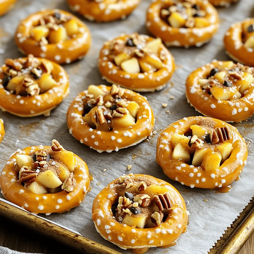 Next, preheat your oven to 350°F (175°C). Line a baking sheet with parchment paper. Place your pretzel bites on the baking sheet in one layer. Grab your caramel sauce—about one cup should do. Use a small spoon to fill each pretzel bite with caramel. Make sure to be generous, but don’t overflow! After that, take the cinnamon-coated apples and top each caramel-filled pretzel with them. If you like, add chopped pecans or mini chocolate chips for extra crunch and flavor.