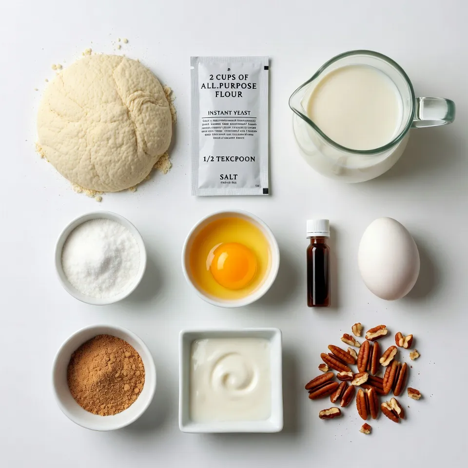 Gather these ingredients before you start. The all-purpose flour gives the buns their structure. Granulated sugar adds sweetness to the dough. Instant yeast helps the buns rise quickly. Salt enhances the flavors. The warmed milk activates the yeast. Unsalted butter adds richness to the dough. A large egg binds everything together. Vanilla extract gives a lovely aroma. Brown sugar brings a deep, caramel flavor. Corn syrup and heavy cream create a gooey filling. Pecans add crunch and nutty taste. Ground cinnamon spices up the mix.