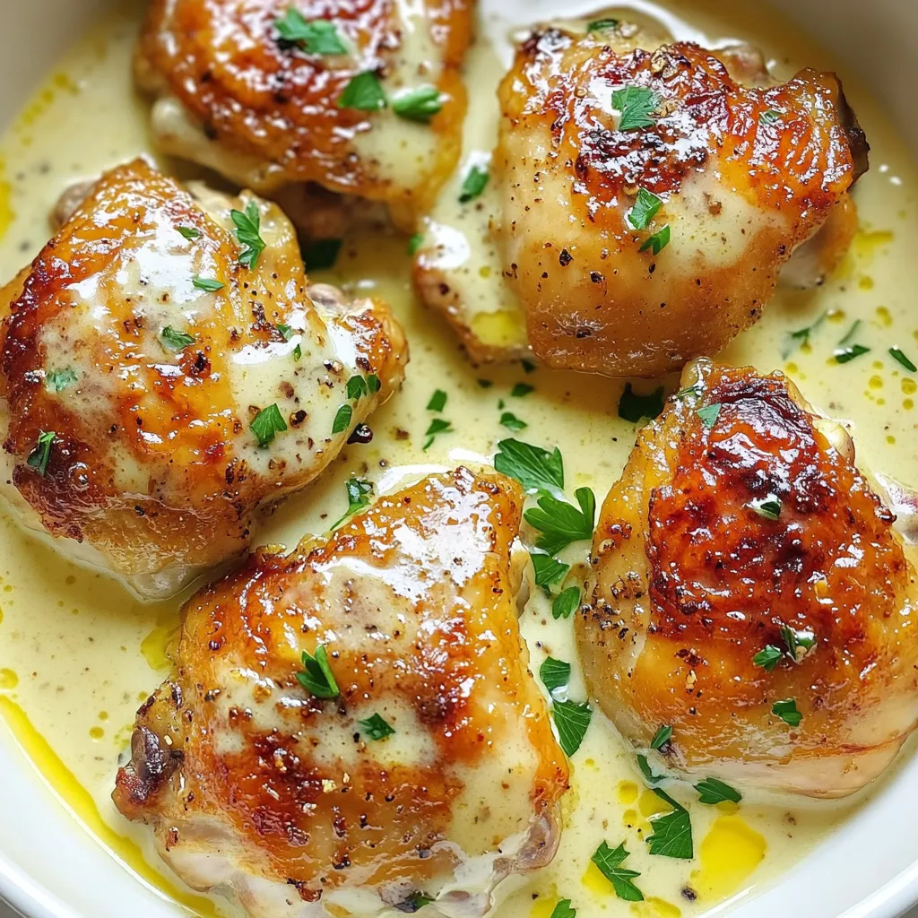 A delicious skillet dish featuring tender chicken thighs cooked in a creamy garlic sauce.