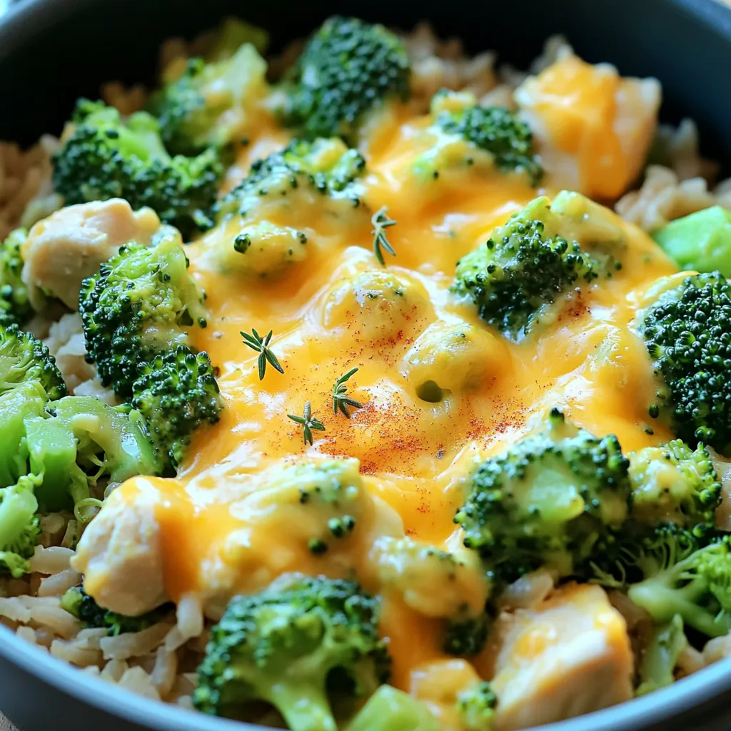 Finally, fluff the mixture with a fork to combine everything nicely. Serve it hot in bowls or on plates. For a garnish, consider adding fresh herbs like parsley or a sprinkle of extra cheese on top. This makes your dish look inviting and tasty. Enjoy your Cheesy Broccoli Rice Chicken One Pot Delight!
