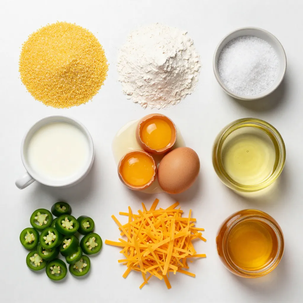 First, gather all your ingredients. You need cornmeal, flour, baking powder, and salt. Also, grab buttermilk, eggs, vegetable oil, and cheddar cheese. Don’t forget the jalapeños! If you like it sweet, have honey ready too.