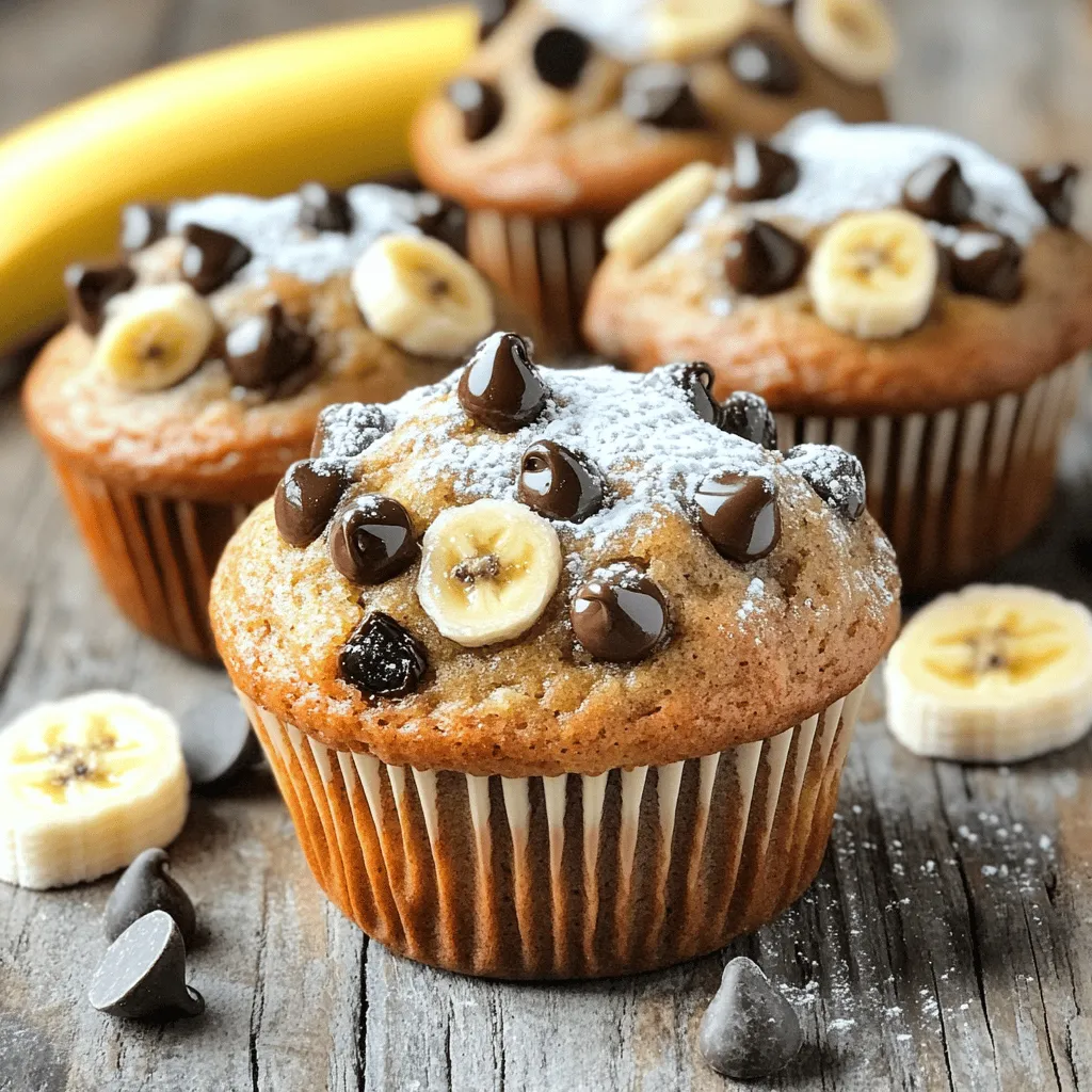 - 3 ripe bananas, mashed - 1/3 cup melted coconut oil (or unsalted butter) - 1/2 cup brown sugar - 1 large egg - 1 teaspoon vanilla extract To make these muffins, you need ripe bananas. They should be soft and sweet. The coconut oil adds moisture. If you prefer, use unsalted butter instead. Brown sugar gives a rich flavor and helps keep the muffins soft. The egg binds everything together, while vanilla adds warmth and depth. - 1 teaspoon baking soda - Pinch of salt - 1 cup all-purpose flour - 1/2 cup chocolate chips (dark or semi-sweet) - 1/4 cup chopped walnuts (optional) Baking soda helps the muffins rise. A pinch of salt balances the sweetness. All-purpose flour is the base for the muffins. Chocolate chips bring the joy, and walnuts add crunch if you like. - Alternatives for bananas: You can use applesauce or pumpkin puree. - Different types of sweeteners: Try honey or maple syrup if you want. - Vegan options for butter and egg: Use coconut oil and a flax egg instead. If bananas are not available, applesauce works well. It keeps the muffins moist. You can swap brown sugar for honey or maple syrup. For a vegan twist, mix one tablespoon of ground flaxseed with three tablespoons of water to replace the egg. These swaps offer flexibility while keeping the muffins tasty. 1. First, preheat your oven to 350°F (175°C). This step is key for even baking. 2. Prepare your muffin tin by lining it with paper liners or greasing it with cooking spray. This keeps the muffins from sticking. 3. In a large mixing bowl, mash three ripe bananas. Then, add 1/3 cup of melted coconut oil. Mix these two until smooth. This creates a rich base for your muffins. 4. Next, add 1/2 cup of brown sugar, 1 large egg, and 1 teaspoon of vanilla extract to your banana mixture. 5. Stir well until it’s creamy and well combined. This mix gives the muffins their sweet flavor. 6. Now, sprinkle in 1 teaspoon of baking soda and a pinch of salt. Gently mix these into your wet ingredients. 7. Gradually add 1 cup of all-purpose flour. Mix just until the flour disappears. The batter should be slightly lumpy. Avoid overmixing; it can make the muffins tough. 8. Fold in 1/2 cup of chocolate chips and, if you like, 1/4 cup of chopped walnuts. This adds great texture and flavor to your muffins. 9. Portion the batter into your prepared muffin tin, filling each cup about 2/3 full. This gives them room to rise. 10. Place the muffin tin in your preheated oven. Bake for 18-20 minutes. 11. To check for doneness, insert a toothpick into the center of a muffin. If it comes out clean, they are ready. If not, bake a few more minutes. - Avoiding overmixing the batter: Mix the batter gently. Overmixing makes muffins tough. Aim for a slightly lumpy texture. This keeps them light and fluffy. - How to store batter and dough before baking: If you cannot bake right away, cover the bowl tightly. Place it in the fridge for up to 30 minutes. This helps keep the batter fresh. - Garnishing ideas, like powdered sugar: A sprinkle of powdered sugar adds a nice touch. It makes your muffins look more appealing and tasty. - Pairing suggestions for serving: Serve warm with sliced bananas or a scoop of vanilla ice cream. This makes for a delightful treat that everyone will love. - Best practices for storing leftovers: Store leftover muffins in an airtight container. Keep them at room temperature for up to 3 days. If you want them to last longer, freeze them. - Reheating tips for maintaining freshness: To reheat, place muffins in the microwave for about 15 seconds. This warms them up and keeps them soft. {{image_2}} You can make your chocolate chip banana muffins even more fun by adding spices. Cinnamon and nutmeg work well with bananas. Just a pinch can change the taste. You can also mix in dried fruits like raisins. This adds sweetness and a chewy texture. Try different combinations to find your favorite flavor! If you need gluten-free muffins, use almond flour or a gluten-free blend. This keeps the muffins soft and tasty. For nut-free or dairy-free options, swap out coconut oil for a safe oil. You can also use non-dairy milk instead of the egg. These changes keep your muffins friendly for all diets! Experiment with different types of chocolate chips. Dark, semi-sweet, or even white chocolate can change the flavor. You can also use chocolate chunks instead of chips for a rich, gooey texture. This gives a fun surprise in every bite! Try different chocolates to see what you like best. Store your chocolate chip banana muffins at room temperature for the best taste. Keep them in an airtight container. This will help them stay fresh and moist. If it’s warm in your kitchen, consider using the fridge. But be aware, cold can change the texture. At room temperature, these muffins last for about three days. If you want them to last longer, freeze them. Place cooled muffins in a freezer-safe bag. They can last up to three months in the freezer. Remember to label the bag with the date. Over time, muffins may become stale. Look for dryness or a hard texture. If you see mold, throw them away. For safe eating, always check before enjoying. If they smell off, it’s best to discard them. Yes, you can use frozen bananas. Just thaw them first. Frozen bananas may make your muffins a bit moister. This extra moisture can enhance the flavor. Your muffins will still taste great! You can make simple swaps for healthier muffins. For example, use whole wheat flour instead of all-purpose flour. You can also replace brown sugar with honey or maple syrup. Another idea is to cut back on chocolate chips or use dark chocolate. Adding nuts boosts healthy fats too! Look for a few signs to check doneness. The tops should be golden brown. If you press gently, they should spring back. You can also check the edges; they should pull away from the pan. A toothpick test is still helpful, but these signs work well too. Absolutely! Doubling the recipe is easy. Just mix all the ingredients in larger bow