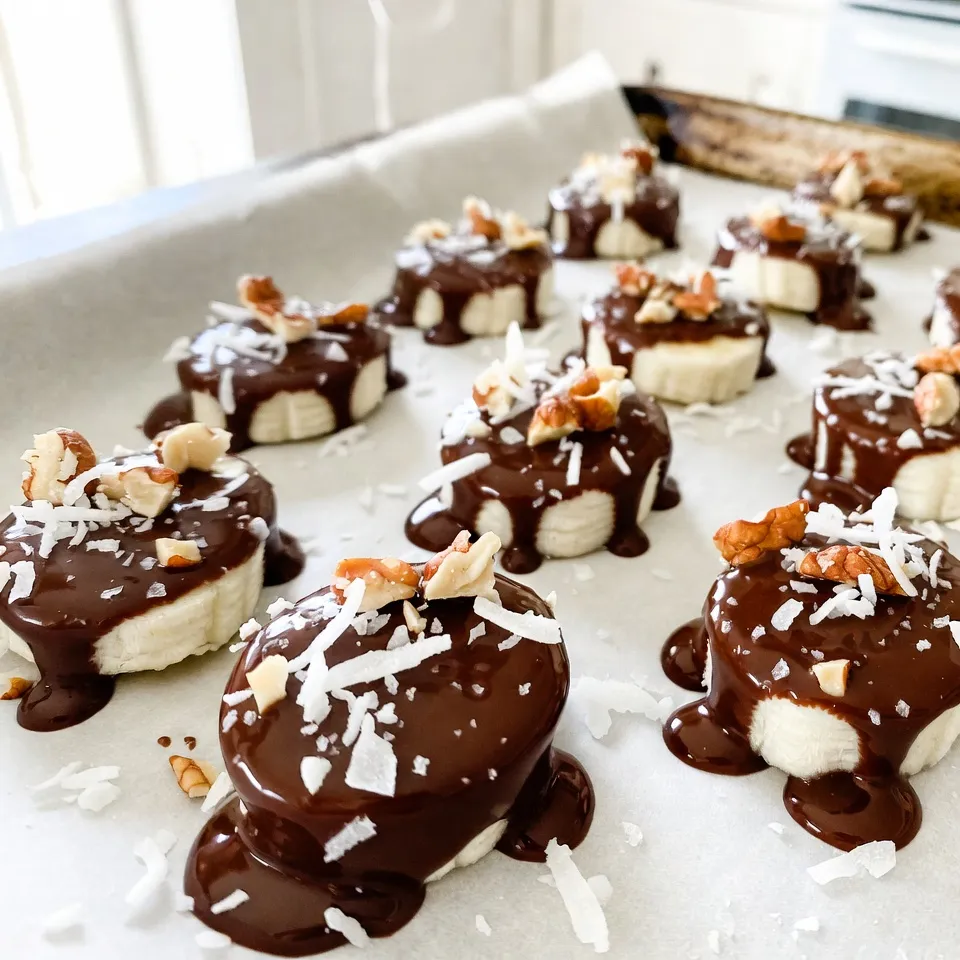 Delicious frozen treats made with banana slices coated in dark chocolate, nuts, and coconut.