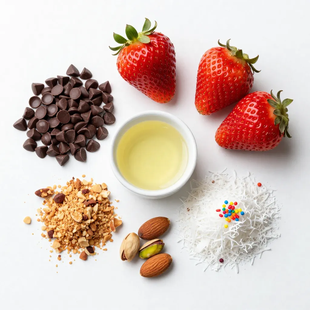 Each ingredient plays an important role. The strawberries give a fresh taste, while the dark chocolate adds rich flavor. Coconut oil helps the chocolate melt smoothly. Crushed nuts and shredded coconut bring texture and crunch. Finally, sprinkles can add a fun touch for any occasion.