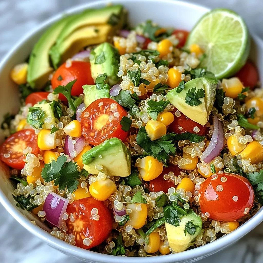 A refreshing salad featuring quinoa, vibrant vegetables, and a zesty lime dressing.