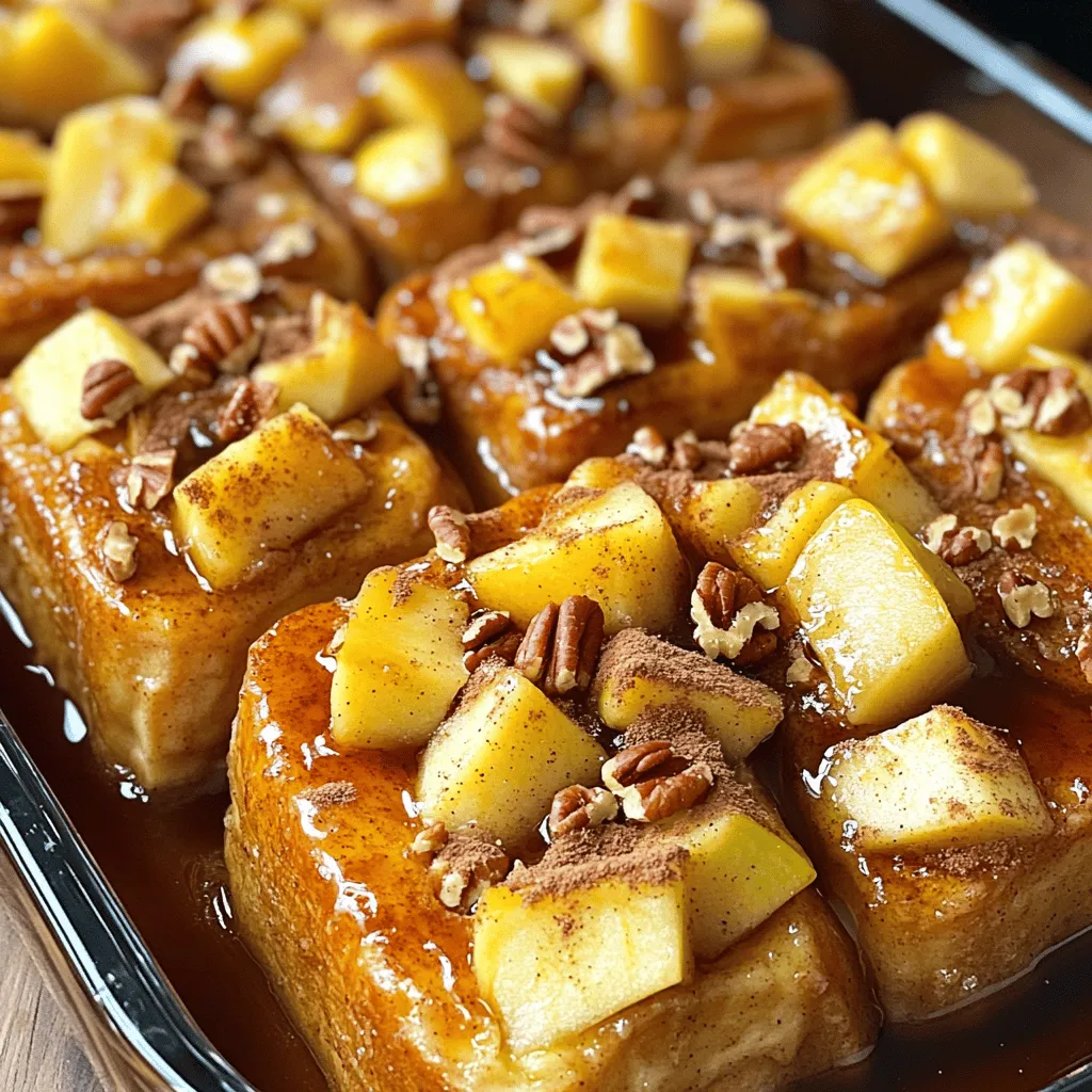 - 6 slices of day-old bread (challah or brioche works best) - 2 large apples, peeled, cored, and diced (Granny Smith or Honeycrisp) - 4 large eggs - 2 cups whole milk - 1/2 cup brown sugar - 1 tablespoon vanilla extract - 1 tablespoon ground cinnamon - 1/4 teaspoon nutmeg For this dish, I love using day-old bread like challah or brioche. This type of bread gives a nice texture after soaking. The apples must be tart and sweet, so I recommend Granny Smith or Honeycrisp. They add great taste and contrast. Next, we have the liquid ingredients. You need four large eggs and two cups of whole milk. The eggs bind the mixture, while milk adds creaminess. For sweetness, we use half a cup of brown sugar. It brings a rich flavor and depth. Don't forget the spices! One tablespoon of vanilla extract gives a lovely aroma. One tablespoon of ground cinnamon is a must for that warm spice. A little nutmeg adds a nice touch too, just a quarter teaspoon. - 1/4 cup chopped pecans or walnuts (optional) - Maple syrup, for serving For extra texture, you can add chopped nuts like pecans or walnuts. They give a nice crunch. Finally, maple syrup is perfect for drizzling on top. It adds sweetness and pairs well with the apples. First, heat your oven to 350°F (175°C). This helps the dish cook evenly. While the oven warms up, grease a 9x13-inch baking dish. You can use butter or cooking spray for this. Next, grab a medium bowl. In it, whisk together four large eggs, two cups of whole milk, and 1/2 cup of brown sugar. Add one tablespoon of vanilla extract, one tablespoon of ground cinnamon, and a pinch of nutmeg. Mix until it looks smooth and creamy. Now, let’s cut the bread. Use six slices of day-old challah or brioche. Cut each slice into cubes. Place half of the bread cubes evenly in your greased dish. In a separate bowl, take two diced apples. You can use Granny Smith or Honeycrisp. Toss the apple pieces with a pinch of cinnamon, then layer them over the bread cubes. Top this with the rest of the bread cubes. Press down lightly to pack them in. Pour the egg and milk mixture evenly over the bread and apples. Make sure every piece is soaked well. If you like, sprinkle some chopped pecans or walnuts on top. Cover the dish with foil and let it sit for about 30 minutes. This soaking time helps the flavors blend. You can also refrigerate it overnight for deeper flavor. Next, bake it covered for 30 minutes. After that, remove the foil and bake for another 15 to 20 minutes. Look for a golden brown top. Let it cool for a few minutes before slicing into squares. Serve warm with maple syrup drizzled on top. Enjoy! Using day-old bread makes a big difference. It soaks up the egg mixture well. Fresh bread might turn mushy. Try using challah or brioche for the best texture. Soaking time is also key. Let the dish sit for at least 30 minutes. This helps the bread absorb flavors. You can even soak it overnight for extra taste. If you need a gluten-free option, use gluten-free bread. Look for a sturdy kind to hold up. For apples, Granny Smith or Honeycrisp work well. You can swap in other types, like Fuji or Gala. Want it sweeter? Use maple syrup or honey as a sweetener. Serving this dish can be fun! Drizzle with warm maple syrup for a classic touch. Top with whipped cream or yogurt for creaminess. You can also sprinkle powdered sugar for a sweet finish. Pair it with bacon or sausage for a hearty breakfast. Enjoy it with fresh fruit for a colorful brunch plate! {{image_2}} You can change up the flavor of your Cinnamon Apple French Toast Bake easily. Adding dried fruits like raisins or cranberries brings extra sweetness. You can also try other spices. A pinch of ground ginger or cardamom can add a warm twist. For a savory version, use cheese and herbs. Crumbled feta or sharp cheddar cheese makes a great pairing with apples. If you want a vegan option, replace eggs with flax eggs. Mix one tablespoon of flaxseed meal with three tablespoons of water. For milk, use almond or oat milk. You can also swap brown sugar with maple syrup or coconut sugar. If you are watching carbs, try low-carb bread. Use sugar substitutes like erythritol for a low-sugar option. Adjust the recipe as you like, and enjoy! To keep your Cinnamon Apple French Toast Bake fresh, store it in the fridge. First, let it cool completely. Then, cover it tightly with plastic wrap or aluminum foil. This keeps it moist. You can also place it in an airtight container. It will last for about 3 to 4 days in the fridge. If you want to store it longer, freezing is a great option. Cut the bake into individual squares. Wrap each piece tightly in plastic wrap, then place them in a freezer bag. They can last for up to 3 months in the freezer. Just remember to label the bags with the date. When you are ready to eat your leftovers, you can reheat them easily. For the best texture, use the oven. Preheat it to 350°F (175°C). Place the squares in a baking dish and cover with foil. Heat for about 15-20 minutes until warm. This keeps the bread soft and the apples tender. If you are in a hurry, you can use the microwave. Place a square on a microwave-safe plate. Heat for about 30 seconds to 1 minute. Check if it is warm enough. The microwave may make the bread a bit soggy, so I prefer the oven method. Enjoy your warm treat! Can I prepare Cinnamon Apple French Toast Bake the night before? Yes, you can prepare it the night before. Just cover it well and chill it in the fridge. This helps the bread soak up the egg mixture. In the morning, bake it as directed. What type of bread works best for this recipe? Day-old bread works best. I recommend using challah or brioche. These breads soak up the egg mixture well and get nice and fluffy. How long can I store leftovers? You can store leftovers in the fridge for up to three days. Make sure to cover them tightly. For longer storage, freeze it for up to three months. Can I bake this in a smaller dish? Yes, you can. If you use a smaller dish, reduce 