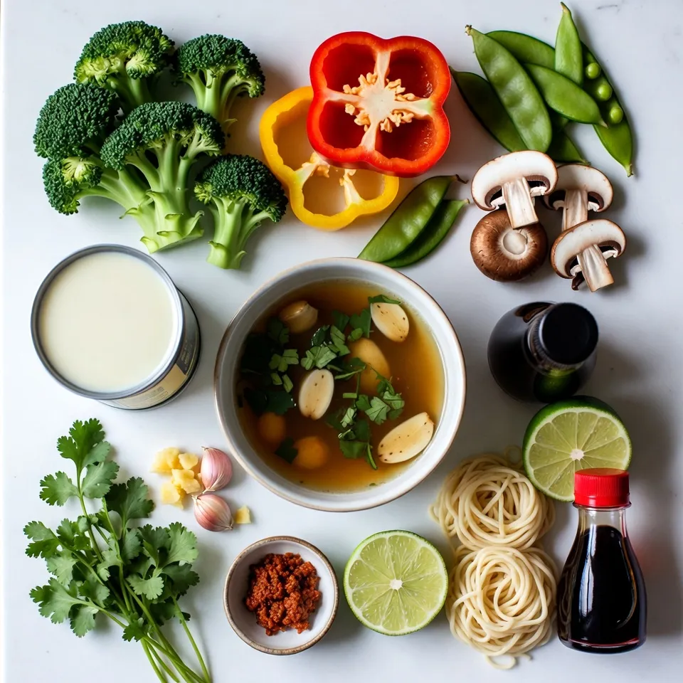 The main ingredients create a rich, creamy base. The vegetable broth brings depth. Coconut milk adds a sweet creaminess. Red curry paste gives it that spicy kick. Ramen noodles are the heart of this dish.