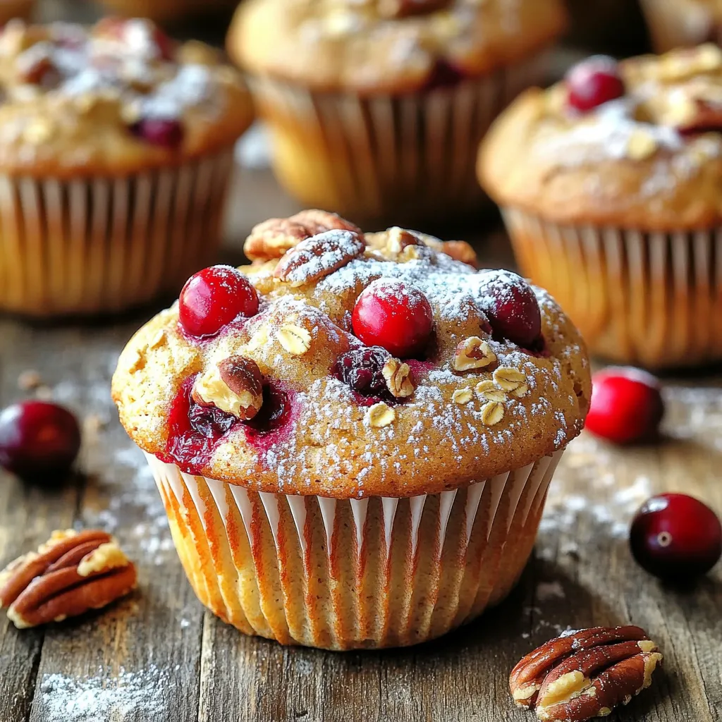 To start, gather these key ingredients for your cranberry pecan muffins: - 1 ½ cups all-purpose flour - ¾ cup granulated sugar - ½ cup packed brown sugar - 1 tablespoon baking powder - ½ teaspoon salt - 1 teaspoon ground cinnamon - 1 large egg - ½ cup milk (can be almond milk) - ⅓ cup vegetable oil - 1 teaspoon vanilla extract - 1 cup fresh or frozen cranberries (if frozen, do not thaw) - ½ cup pecans, chopped - ¼ cup oats (optional, for added texture) You can add a few items to boost flavor: - Zest from one orange for a bright taste - A pinch of nutmeg for warmth - A handful of chocolate chips for sweetness - Chopped walnuts instead of pecans for a different nutty flavor If you need changes, here are some substitutions: - Use whole wheat flour for a healthier option. - Swap sugar with honey or maple syrup for a natural sweetener. - Replace vegetable oil with melted coconut oil for a tropical twist. - Try applesauce instead of the egg for a vegan muffin. - Use non-dairy milk like oat milk for a dairy-free version. These ingredients make your muffins tasty and adaptable. Enjoy mixing and baking! Start by preheating your oven to 350°F (175°C). This step is key for even baking. Next, grab a muffin tin. You can line it with paper liners or just grease it lightly with cooking spray. This helps the muffins come out easily. In a large bowl, whisk together the dry ingredients. Combine 1 ½ cups of flour, ¾ cup of granulated sugar, ½ cup of brown sugar, 1 tablespoon of baking powder, ½ teaspoon of salt, and 1 teaspoon of cinnamon. Mixing these well ensures your muffins have a balanced flavor. In another bowl, beat 1 large egg. Then add ½ cup of milk (you can use almond milk), ⅓ cup of vegetable oil, and 1 teaspoon of vanilla extract. Mix these until smooth. This mixture brings moisture and flavor to your muffins. Now, pour the wet ingredients into the dry ingredients. Use a spatula to stir gently. Stop mixing as soon as everything is combined. It's okay if some lumps remain. This helps keep your muffins light and fluffy. Next, gently fold in 1 cup of cranberries, ½ cup of chopped pecans, and ¼ cup of oats if you want extra texture. Make sure these ingredients are evenly spread throughout the batter. This step adds flavor and crunch to every bite. Divide your batter evenly among the muffin cups. Fill each cup about ¾ full. This will give your muffins room to rise without overflowing. Place the muffin tin in the preheated oven. Bake for 18-20 minutes. Check if they're done by inserting a toothpick into the center of a muffin. If it comes out clean, they are ready. Let the muffins cool in the tin for about 5 minutes before moving them to a wire rack. This cooling step helps them set properly. To get that soft and fluffy muffin, you need to mix well but not too much. Overmixing makes muffins tough. Stir just enough to combine the wet and dry ingredients. Leave some lumps; they are okay! This helps keep the muffins light. Start with dry ingredients in one bowl and wet in another. Whisk the dry mix well to break up any lumps. For the wet mix, beat the egg first, then add the other wet items. When combining, use a spatula to fold gently. Avoid using a mixer; it can create too much air. Serve your cranberry pecan muffins warm for the best taste. You can sprinkle a bit of powdered sugar on top for a nice finish. Enjoy them with coffee or tea. For a fun touch, place a whole pecan on each muffin before baking. This gives a nice look and adds flavor. {{image_2}} You can easily make gluten-free cranberry pecan muffins. Just swap all-purpose flour for gluten-free flour. Many brands work well, so choose one you like. Check the package for any special instructions. The rest of the recipe stays the same. You still get the tasty mix of cranberries and pecans. To make vegan cranberry pecan muffins, replace the egg with a flax egg. Mix one tablespoon of flaxseed meal with three tablespoons of water. Let it sit for five minutes until it thickens. Use almond milk instead of regular milk. You can also choose vegetable oil or coconut oil. These swaps keep the muffins moist and flavorful. You can add fun flavors to your muffins. Try adding orange zest for a citrusy twist. Just use the zest of one orange and mix it in with the wet ingredients. If you're a chocolate fan, mix in half a cup of chocolate chips. They melt and create a yummy treat. You can get creative with spices too. A pinch of nutmeg or ginger can add warmth to your muffins. To keep your cranberry pecan muffins fresh, store them in an airtight container. This helps prevent them from drying out. You can also wrap each muffin in plastic wrap for extra protection. Place them at room temperature if you plan to eat them within a few days. Freezing your muffins is a great way to save them for later. First, let the muffins cool completely. Then, wrap each muffin in plastic wrap and place them in a freezer-safe bag. Remove as much air as possible before sealing. To thaw, simply take a muffin out and leave it at room temperature for about an hour. You can also reheat them in the oven for a warm treat. When stored properly, cranberry pecan muffins last up to 3 days at room temperature. If you freeze them, they can last up to 3 months. Just remember to check for any signs of freezer burn when you take them out. Enjoy your muffins while they’re still fresh and tasty! Yes, you can use dried cranberries. They will give a sweeter taste. Just remember to reduce the sugar slightly. Dried cranberries soak up moisture. The muffins may be a bit denser. To make these muffins healthier, try these tips: - Use whole wheat flour instead of all-purpose flour. - Replace sugar with honey or maple syrup. - Add more nuts or seeds for protein. - Use less oil or replace it with applesauce. - Add fruits like bananas or apples for natural sweetness. Yes, you can replace the egg with a vegan alternative. Use 1 tablespoon of ground flaxseed mixed with 2.5 tablespoons of w
