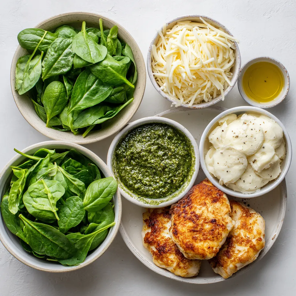 Fresh spinach gives a nice color and adds nutrients. Olive oil helps to sear the chicken and adds flavor. Salt and pepper season the dish just right. Lastly, fresh basil can add a pop of flavor and color if you choose to use it.