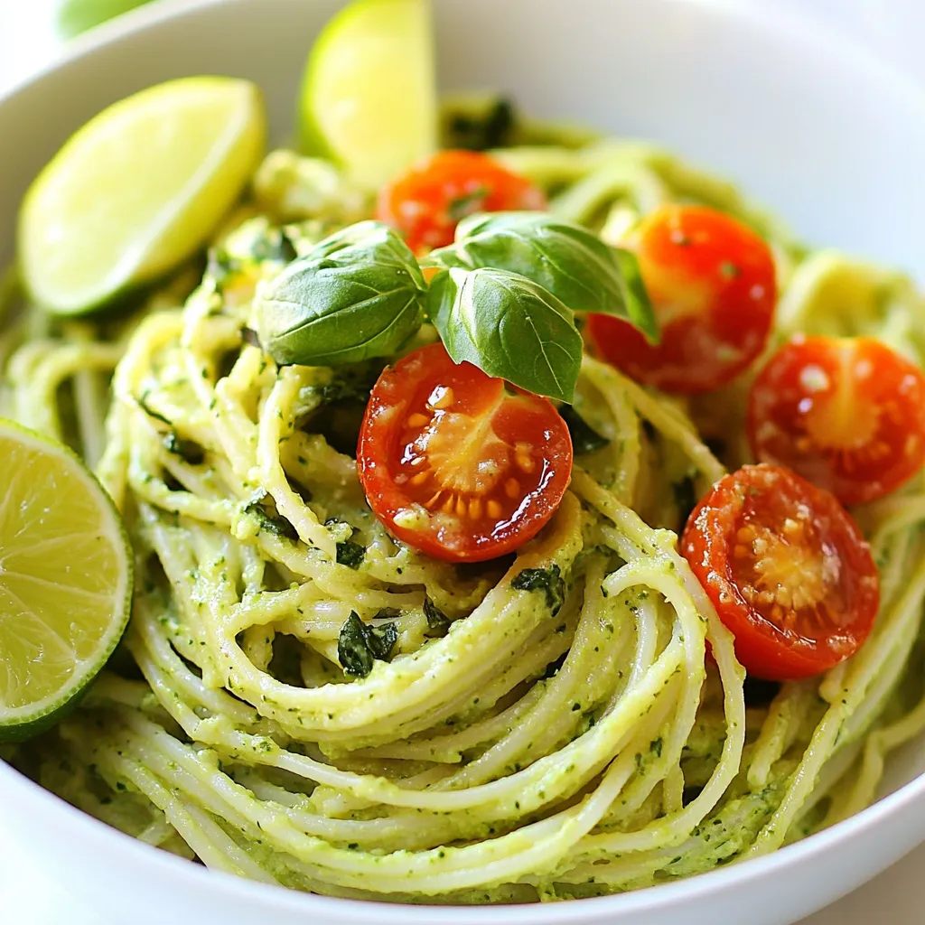 - 2 ripe avocados - 3 tablespoons fresh lime juice - 1 garlic clove, minced - 1/4 cup fresh basil leaves - 1/4 cup extra virgin olive oil - Salt and pepper to taste - 12 ounces pasta (spaghetti or fettuccine works well) - 1/2 cup cherry tomatoes, halved - Fresh cilantro for garnish - Lime wedges for serving To make creamy avocado lime pasta, you need fresh, ripe ingredients. Start with two ripe avocados. They should feel soft but not mushy. Next, you will need three tablespoons of fresh lime juice. This adds a bright, zesty flavor. A single garlic clove, minced, brings a nice kick to the dish. Use about a quarter cup of fresh basil leaves for a fragrant touch. The olive oil helps blend the sauce smoothly, so grab a quarter cup of extra virgin olive oil. Don't forget salt and pepper to taste. Choose spaghetti or fettuccine for your pasta. Both work well and will hold the sauce nicely. You also need half a cup of cherry tomatoes. Halve them to add color and sweetness to your dish. For garnishes, have fresh cilantro ready. Lime wedges will also add a fresh burst of flavor when serving. Each ingredient plays a vital role in making this dish creamy and delicious. {{ingredient_image_1}} Start by bringing a large pot of salted water to a boil. The salt adds flavor to the pasta. Once boiling, add 12 ounces of your chosen pasta, like spaghetti or fettuccine. Cook the pasta according to the package instructions until it becomes al dente. This means it should be firm to the bite. After cooking, drain the pasta but make sure to save about 1 cup of the pasta water. This water helps later with the sauce. In a food processor, combine 2 ripe avocados, 3 tablespoons of fresh lime juice, 1 minced garlic clove, and 1/4 cup of fresh basil leaves. Blend these ingredients until the mixture is smooth and creamy. While blending, slowly drizzle in 1/4 cup of extra virgin olive oil. This helps the sauce come together and adds richness. After blending, taste the sauce. Add salt and pepper to enhance the flavor. If the sauce is too thick, use the reserved pasta water to reach your desired consistency. In a large mixing bowl, combine the cooked pasta with the avocado sauce. Toss everything together until the pasta is evenly coated. If the sauce feels too thick, add a bit more of the reserved pasta water. This will help loosen it up. Next, gently fold in 1/2 cup of halved cherry tomatoes. Mix them in well so they are spread throughout the pasta. This adds freshness and color. Serve the pasta right away, garnished with fresh cilantro and lime wedges for an extra flavor boost. To enhance the flavor of your avocado sauce, I suggest using fresh lime juice and a pinch of salt. You can also add crushed red pepper for a spicy kick. For more depth, try adding a sprinkle of smoked paprika. If your sauce is too thick, don’t worry! Just add a bit of reserved pasta water. This water has starch that helps thicken the sauce without losing creaminess. Start with a tablespoon and mix until you reach the right consistency. For an elegant look, plate the pasta in shallow bowls. This helps show off the vibrant green color of the sauce. Add a sprig of fresh basil on top for decoration. You can also drizzle a little extra olive oil over the pasta before serving. To make your dish pop, add halved cherry tomatoes and fresh cilantro. These not only add flavor but also brighten up your plate. Serve lime wedges on the side for a zesty finish. One common mistake is overcooking the pasta. Always follow package instructions and check for al dente. The pasta should be firm to the bite for the best texture. Another pitfall is letting the sauce lose its creamy texture. If you mix the sauce too aggressively, it can become grainy. Gently fold the sauce into the pasta until everything is evenly coated. This keeps it smooth and delicious. Pro Tips Use Ripe Avocados: Ensure your avocados are perfectly ripe for the creamiest sauce. A ripe avocado should yield slightly to gentle pressure when squeezed. Customize Your Herbs: Experiment with different herbs like cilantro or parsley to switch up the flavor profile of your sauce. Optimal Pasta Cooking: Always cook pasta al dente for the best texture, and remember to reserve some pasta water for adjusting the sauce consistency. Serving Suggestions: For added flavor, consider topping the dish with crumbled feta or grated Parmesan cheese before serving. {{image_2}} For an extra boost, you can add protein to your pasta. Here are some tasty options: - Grilled chicken: Slice it thin and mix it in. - Shrimp: Cook shrimp in olive oil for a quick addition. - Tofu: Use firm tofu for a plant-based choice. - Chickpeas: These add protein and a nice texture. Each protein helps make this dish filling and satisfying. If you want a vegan version, simply swap the regular pasta for gluten-free pasta. Here are some easy swaps: - Use chickpea pasta or lentil pasta for a great texture. - Instead of cheese, add nutritional yeast for a cheesy flavor. You’ll enjoy a creamy, plant-based dish that fits any diet. You can mix up the flavors for fun. Here are some ideas: - Add red pepper flakes for a spicy kick. - Stir in fresh spinach for extra greens. - Use cilantro instead of basil for a fresh twist. - Try lemon juice for a zesty change. These small changes can create a whole new dish each time! To keep your creamy avocado lime pasta fresh, store it in an airtight container. Place it in the fridge within two hours of cooking. This helps prevent bacteria growth. The pasta will stay good for about 2-3 days. If you can, keep the sauce and pasta separate. This helps maintain the creamy texture. When reheating, avoid the microwave if you can. It can make the pasta dry. Instead, use a skillet on low heat. Add a splash of water or olive oil. Stir gently until warm. If you prefer the microwave, use a microwave-safe dish. Heat in short bursts, stirring in between. You can freeze leftover creamy avocado lime pasta, but it may change texture.
