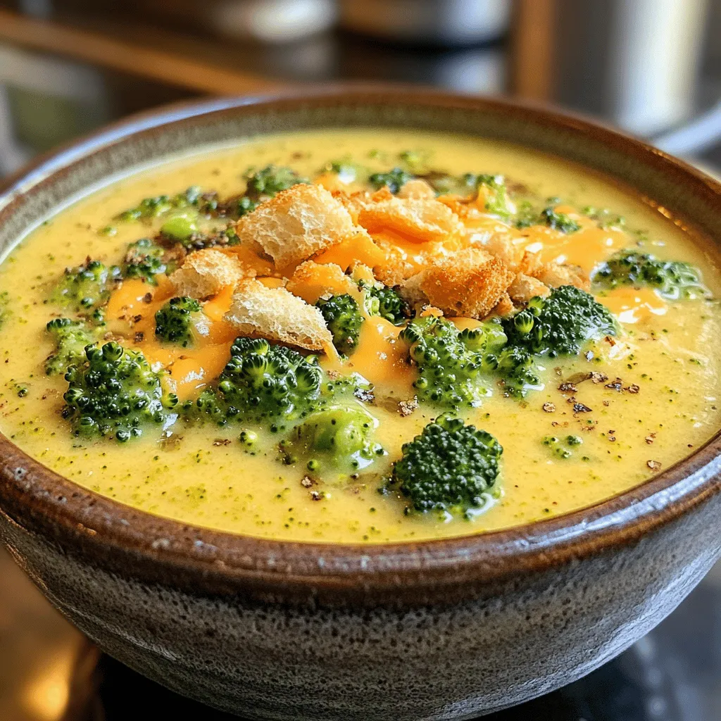To make this creamy broccoli cheddar soup, gather these simple ingredients: - 4 cups broccoli florets (fresh or frozen) - 1 medium onion, chopped - 3 cloves garlic, minced - 4 cups vegetable broth - 2 cups shredded sharp cheddar cheese - 1 cup heavy cream or coconut milk (for a dairy-free option) - 1 teaspoon dried thyme - 1 teaspoon onion powder - Salt and pepper to taste - Optional: Croutons and extra cheddar for topping If you want a dairy-free twist, replace heavy cream with coconut milk. This gives the soup a rich, creamy taste without dairy. Use a dairy-free cheese if you want to keep it cheesy. Nutritional yeast is a great option for a cheesy flavor without dairy. Choosing fresh broccoli is key for this soup. Look for bright green florets with tight clusters. Avoid yellowing or wilting. The stems should feel firm and not soft. If you can, buy organic broccoli for better taste and fewer pesticides. Fresh broccoli will add more nutrients and flavor to your soup. Start by getting your slow cooker ready. Take 4 cups of broccoli florets, fresh or frozen, and add them to the pot. Next, chop one medium onion and mince three cloves of garlic. Toss these into the slow cooker with the broccoli. This mix adds great flavor. Now, pour in 4 cups of vegetable broth. Make sure the broth covers all the veggies. This step is key for a tasty soup. Next, add 1 teaspoon of dried thyme and 1 teaspoon of onion powder. Season with salt and pepper to taste. Stir everything together gently. Cover the slow cooker and cook on low for 4-5 hours, or on high for 2-3 hours. Check that the broccoli is tender before moving on. After cooking, it’s time to blend. If you have an immersion blender, use it to puree the soup until smooth. If you like some chunks, blend half and leave the rest as is. Now for the best part—add 2 cups of shredded sharp cheddar cheese and 1 cup of heavy cream or coconut milk. Stir until the cheese melts and everything is mixed well. Taste the soup and adjust the seasoning if needed. To boost the flavor of your creamy broccoli cheddar soup, use fresh herbs. Thyme adds depth. You can also try adding a squeeze of lemon juice. This gives a bright note to the dish. If you like a bit of heat, add a pinch of red pepper flakes. For extra richness, use good quality cheese. Sharp cheddar makes a big difference. A few common mistakes can ruin your soup. First, don’t skip the garlic. It adds great taste. Second, avoid overcooking the broccoli. You want it tender but not mushy. If you blend too long, you’ll lose the nice texture. Lastly, don’t forget to taste as you go. Adjusting salt and pepper can take your soup to the next level. Store your soup in airtight containers. It will stay fresh in the fridge for about three days. To reheat, warm it slowly on the stove. Stir often to keep it smooth. If the soup thickens too much, add a splash of broth or cream. You can also freeze the soup, but it may change texture. To thaw, let it sit overnight in the fridge before reheating. {{image_2}} You can make this creamy broccoli cheddar soup even heartier by adding protein. Chicken works great! Simply cook and shred some chicken breasts before adding them to the slow cooker. Cooked bacon is another tasty option. Chop it up and stir it in right before serving. The smoky flavor from the bacon adds a nice touch. If you want a vegetarian twist, swap out the chicken for beans. White beans or chickpeas add protein without meat. You can also toss in some tofu for a chewy texture. Just make sure the tofu is firm. Cook it in the slow cooker with the other veggies to soak up all the flavors. Cheddar cheese is classic, but feel free to mix it up! Try gouda for a rich taste or pepper jack for a spicy kick. You can even blend different cheeses. Just remember to choose cheeses that melt well. This way, your soup stays creamy and delicious. To store your creamy broccoli cheddar soup, let it cool first. Once cooled, pour it into an airtight container. This keeps the soup fresh and prevents spills. Label the container with the date. Use glass or BPA-free plastic containers for best results. You can freeze this soup if you want to enjoy it later. Pour the cooled soup into freezer-safe bags or containers. Leave some space at the top to allow for expansion. Seal tightly to avoid freezer burn. The soup can last in the freezer for up to three months. In the fridge, your creamy broccoli cheddar soup lasts about 3 to 4 days. Be sure to store it in an airtight container. If you see any signs of spoilage, like off smells or mold, throw it out. Always reheat only what you plan to eat. This keeps the remaining soup fresh longer. Yes, you can use frozen broccoli. It works just as well as fresh. Frozen broccoli is usually pre-cut and blanched. This means it will cook evenly. Just add it directly to your slow cooker. No need to thaw it first. This saves time and effort. To make your soup spicier, add crushed red pepper flakes. Start with a small amount. You can always add more if needed. Another option is to stir in some diced jalapeños. For a smoky heat, try adding smoked paprika. Adjust to your taste for the perfect kick. If you want a lighter option, use coconut milk. It adds creaminess without dairy. Another great alternative is cashew cream. Just blend soaked cashews with water until smooth. You can also use half-and-half for a milder choice. Each option keeps your soup delicious and creamy. This soup is easy to make and full of flavor. We covered fresh ingredients, slow cooking, and blending for creaminess. I shared tips on how to enhance flavor and avoid common mistakes. You can customize it with proteins or vegetarian options. Plus, I outlined the best storage tips to keep it fresh. Remember, you can always tweak the recipe to fit your taste or needs. Enjoy a warm bowl of this delicious soup today!