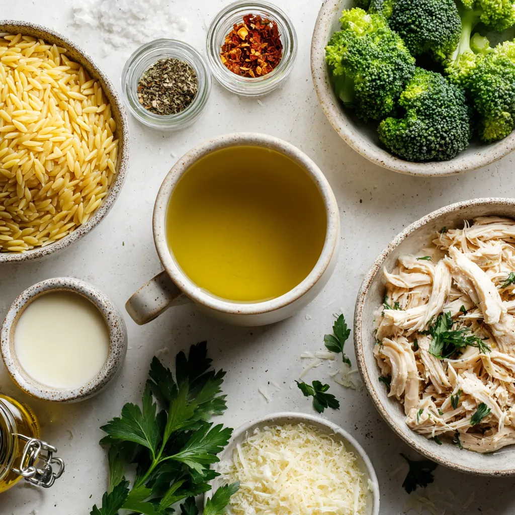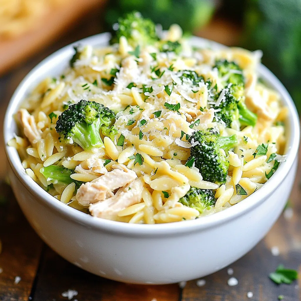 A delicious and creamy dish featuring orzo pasta, chicken, and broccoli.