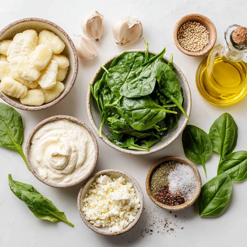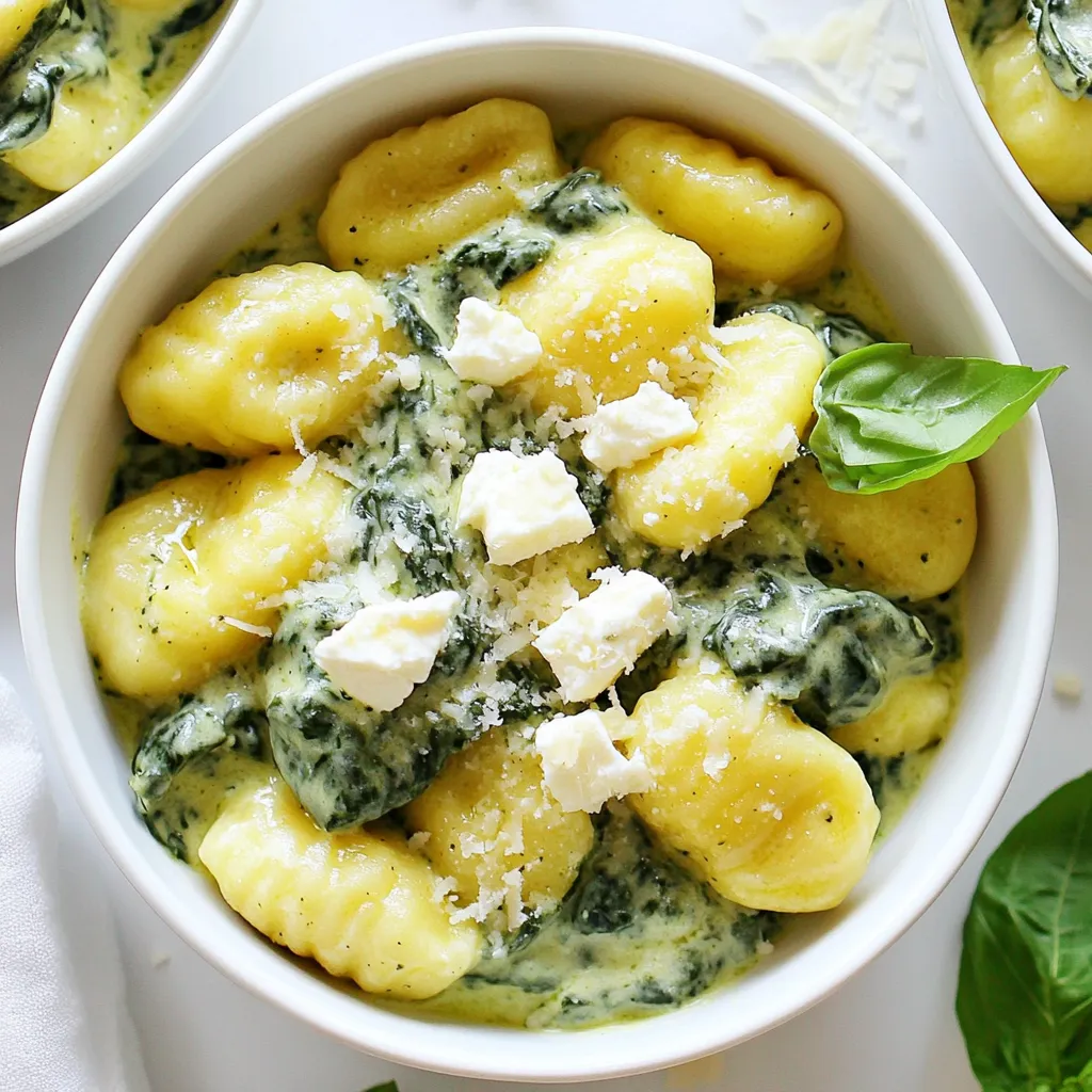 A rich and creamy gnocchi dish featuring fresh spinach and crumbled feta cheese.