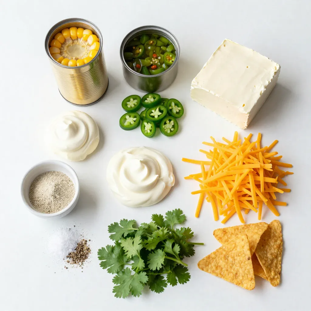 To make creamy jalapeño corn dip, gather these key ingredients: