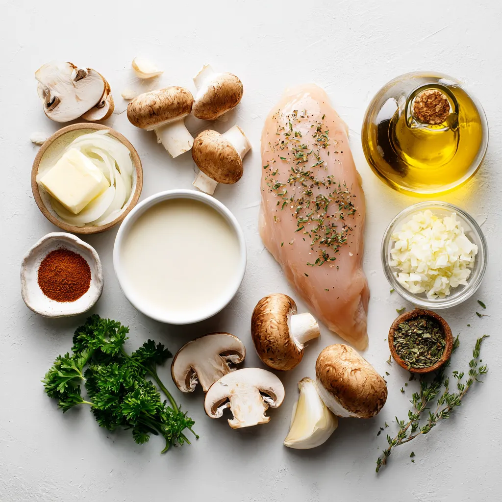 This creamy mushroom chicken skillet is simple yet packed with flavor. You will need two boneless, skinless chicken breasts. Choose fresh mushrooms, like cremini or button, for the best taste. I prefer using a small onion, finely chopped, to add sweetness. Garlic is a must; three cloves, minced, bring it all together.