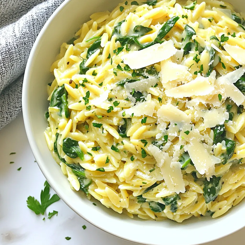 A delicious and creamy orzo pasta dish with fresh spinach and Parmesan cheese.