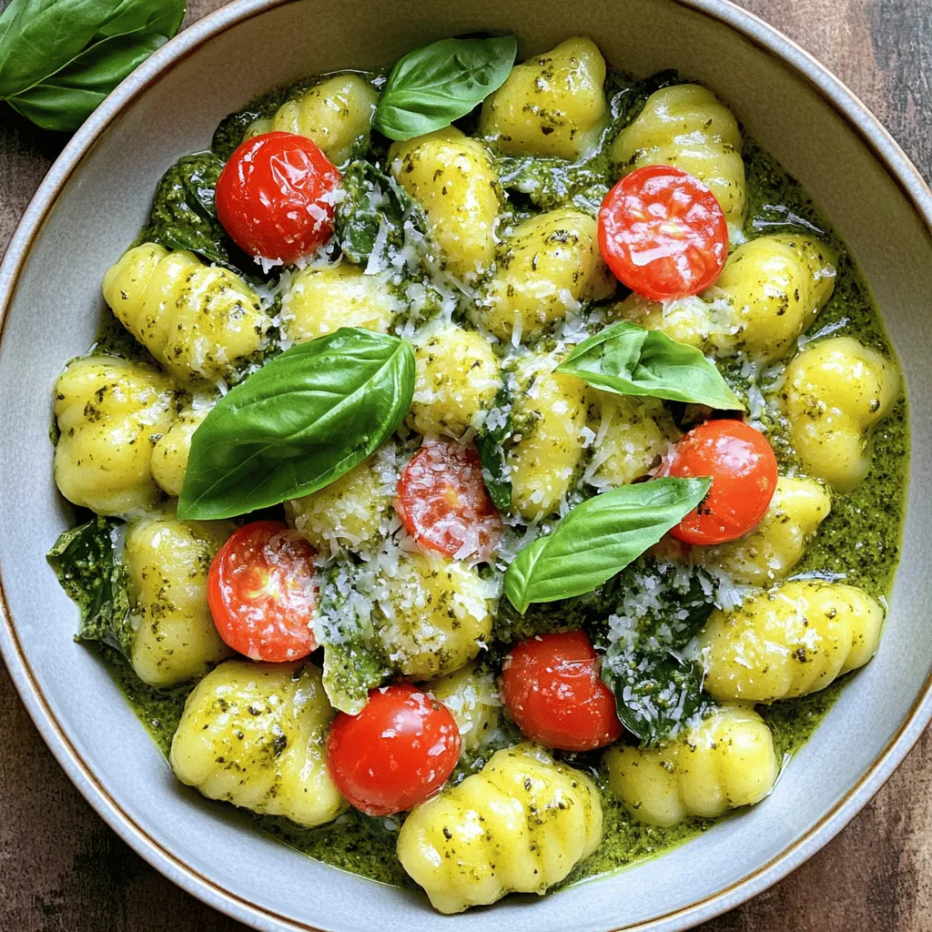 Next, add 1 cup of halved cherry tomatoes to the skillet. Cook them for 3-4 minutes until they soften and start to blister. Then, toss in 1 cup of spinach leaves. Cook them until they are wilted, about 2 minutes. Pour in 1 cup of heavy cream and bring it to a gentle simmer. Stir in 1/2 cup of basil pesto and 1/2 cup of grated Parmesan cheese. Mix until smooth. Gently fold in the cooked gnocchi, ensuring they are well-coated. Cook for another 2-3 minutes to meld the flavors. Season with salt and pepper to taste.