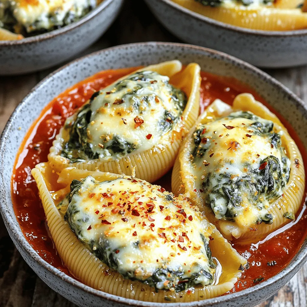 - 20 jumbo pasta shells - 2 cups ricotta cheese - 1 cup fresh spinach, chopped - 1 cup mozzarella cheese, shredded - 1/2 cup parmesan cheese, grated - 1 teaspoon garlic powder - 1 teaspoon onion powder - 1/2 teaspoon salt - 1/4 teaspoon black pepper - 2 cups marinara sauce - 1 tablespoon olive oil - 1/4 teaspoon red pepper flakes (optional for a kick) Jumbo pasta shells are perfect for holding the creamy filling. They make each bite soft and satisfying. Ricotta cheese gives a rich, creamy texture. It blends well with the chopped spinach. Fresh spinach adds bright green color and nutrients. Mozzarella cheese melts beautifully and gives a gooey feel. Parmesan cheese brings a salty, nutty flavor to the dish. Garlic powder and onion powder add depth to the filling. Salt and black pepper enhance all the flavors in the dish. Marinara sauce ties everything together with its rich taste. Olive oil adds a touch of richness and helps the cheese brown. Red pepper flakes give a little heat, but you can skip them if you like it mild. If you want a lighter option, use cottage cheese instead of ricotta. For a dairy-free version, try cashew cheese or tofu. Spinach can be swapped with kale or Swiss chard for a different green. You can use any cheese you prefer, like gouda or cheddar. If you want a gluten-free dish, look for gluten-free pasta shells. You can also use homemade sauce instead of store-bought marinara for a fresh twist. 1. Preheat the oven to 375°F (190°C). This helps cook the dish evenly. 2. Cook the jumbo pasta shells as directed on the package. Make sure they are al dente. Drain them and set aside. This keeps them firm for stuffing. 3. Mix the filling. In a large bowl, combine ricotta cheese, chopped spinach, half of the mozzarella cheese, and parmesan cheese. Add garlic powder, onion powder, salt, black pepper, and red pepper flakes if you want some heat. Mix until it’s smooth and creamy. - Filling the shells: Use a spoon or piping bag to fill each cooked shell with the creamy mixture. Make sure to pack it gently but firmly. - Layer the baking dish: Pour a thin layer of marinara sauce on the bottom of a large baking dish. This keeps the shells from sticking and adds flavor. 1. Arrange the shells in the dish, placing them seam side up. This helps them hold together while baking. 2. Top with sauce: Pour the rest of the marinara sauce over the shells. Then sprinkle the remaining mozzarella cheese on top. 3. Drizzle olive oil over everything. Cover the dish with aluminum foil. This keeps moisture in during baking. 4. Bake for 25 minutes. After that, remove the foil and bake for another 10 minutes. Look for bubbly, golden cheese as a sign it’s ready. 5. Cool slightly before serving. This lets the flavors settle and makes it easier to serve. Enjoy the cheesy goodness! One common mistake is overcooking the pasta shells. Cook them until they are just al dente. This keeps them firm for filling. Another mistake is skipping the mixing of the filling. Make sure each ingredient combines well for even flavor. Lastly, don't forget to cover the dish with foil while baking. This helps the shells cook evenly and stay moist. Filling the shells can be tricky. Use a spoon or a piping bag for ease. If using a spoon, hold the shell upright. Fill from the wide end and push down gently. Do not overstuff the shells; too much filling can make a mess. Aim for a nice, even distribution of the creamy spinach mixture. To boost the flavor of your filling, try adding fresh herbs like basil or parsley. A squeeze of lemon juice brightens the taste. For a kick, mix in extra red pepper flakes. Pair the dish with a variety of cheeses. You can use goat cheese for a tangy twist or add feta for a Mediterranean vibe. {{image_2}} You can keep Creamy Spinach Stuffed Shells vegetarian without losing flavor. Try adding other veggies like mushrooms or bell peppers. These will give more texture and taste. You can also mix in artichoke hearts for a unique twist. This keeps the dish fresh and exciting. If you want more protein, add cooked chicken or turkey to the filling. Simply shred or chop the meat and mix it with the cheese and spinach. For a meaty touch, try ground beef or sausage. This adds heartiness and makes the meal even more filling. For gluten-free shells, look for gluten-free pasta options. Many brands offer jumbo shells made from rice or corn. These cook well and taste great. You can also use zucchini noodles for a lighter dish. Just slice zucchini thin and layer it like pasta. This keeps the flavors rich and the meal healthy. After enjoying your Creamy Spinach Stuffed Shells, store leftovers properly. Place the shells in an airtight container. Make sure they cool to room temperature first. You can keep them in the fridge for up to three days. If you notice any moisture, use a paper towel to absorb it. This helps keep the shells fresh. Freezing your stuffed shells is easy. First, let them cool completely. Then, arrange the shells in a single layer on a baking sheet. Freeze them for about one hour. This prevents them from sticking together. After that, transfer the shells to a freezer-safe bag or container. They can last up to three months in the freezer. When you're ready to eat, just thaw overnight in the fridge. To reheat your Creamy Spinach Stuffed Shells, preheat the oven to 350°F (175°C). Place the shells in a baking dish. If they seem dry, add a splash of marinara sauce on top. Cover the dish with foil to keep moisture in. Heat for about 20 minutes or until hot. You can also reheat them in the microwave. Use a microwave-safe dish and cover it. Heat in short bursts, stirring in between, until warm. Enjoy your delicious meal! To make the filling creamier, add more ricotta cheese. You can also mix in a bit of cream cheese. This will give the filling a rich taste. Another tip is to use heavy cream instead of some ricotta. Blend the cheeses until smooth for a silky texture. Yes, you can make this dish ahead of time.