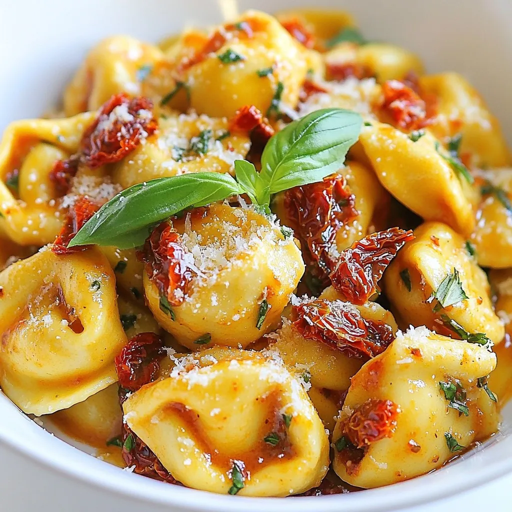 - 1 package (9 oz) cheese tortellini - 1 cup heavy cream - ½ cup sun-dried tomatoes, chopped - 2 cloves garlic, minced - ¼ cup grated Parmesan cheese - 1 tablespoon olive oil - 1 teaspoon Italian seasoning - Salt and pepper to taste - Fresh basil, for garnish For this creamy sun-dried tomato tortellini, you will need three main ingredients. First, grab a package of cheese tortellini. The cheese inside adds a nice, rich flavor. Next, use heavy cream. It makes the sauce thick and smooth. Lastly, get some sun-dried tomatoes. They add a sweet and tangy taste that shines in the dish. After the main ingredients, you need a few extras. Mince two cloves of garlic. It brings a strong aroma to the dish. Grated Parmesan cheese adds a salty kick. A tablespoon of olive oil helps cook the garlic. Now, let's talk about seasonings. Italian seasoning gives the dish a cozy, herby taste. Add salt and pepper to bring out all the flavors. Finally, fresh basil is perfect for garnishing. It adds a pop of color and flavor to your plate. With these ingredients, you are ready to make a delicious meal. {{ingredient_image_1}} - Cooking the tortellini: First, fill a large pot with water and add salt. Bring it to a boil. Add the tortellini and cook according to the package instructions. You want them to be al dente. This means they should be firm but not hard. Once done, drain them and set aside. - Sautéing garlic and sun-dried tomatoes: Next, heat olive oil in a large skillet over medium heat. Add minced garlic and sauté for about one minute. You want it fragrant but not burned. Then, stir in the chopped sun-dried tomatoes and Italian seasoning. Cook for another two minutes. This helps mix all the flavors well. - Combining heavy cream and seasonings: Now, pour in the heavy cream and bring it to a gentle simmer. Simmer for about three to four minutes. This helps the sauce thicken a bit. Stir it often to avoid sticking. - Adding Parmesan cheese: After the sauce thickens, add the grated Parmesan cheese. Stir it in until it melts and makes the sauce creamy. Season with salt and pepper to taste. Adjust the flavors as you like. - Mixing tortellini with the sauce: Now, add the cooked tortellini to the skillet. Gently toss them in the creamy sauce. Cook for another two minutes to warm everything through. - Garnishing before serving: Finally, remove the skillet from heat. Garnish with fresh basil before serving. This adds color and a fresh taste. Enjoy your creamy sun-dried tomato tortellini! To cook tortellini al dente, boil it in salted water. Check the package for timing. It should be firm but not hard. After cooking, drain it right away. Rinse briefly in cold water. This helps prevent sticking. To prevent clumping, toss the drained tortellini with a little olive oil. This keeps them separate and adds flavor. Stir gently to coat every piece. For added flavor, consider herbs like fresh basil or parsley. Thyme and oregano also work well. A pinch of red pepper flakes gives a nice kick too. You can add protein to this dish. Cooked chicken or shrimp blend well with the creamy sauce. Just toss them in when you mix the tortellini. Pair this dish with a fresh side salad. A simple green salad with a light vinaigrette complements the rich sauce. Garlic bread is another great choice. It soaks up the creamy goodness. For plating, serve the tortellini in a shallow bowl. Add a sprinkle of Parmesan on top. Finish with a basil leaf for color. This makes the dish look as good as it tastes! Pro Tips Cook Tortellini Al Dente: Be careful not to overcook the tortellini; they should be firm to the bite for the best texture in the dish. Use Good Quality Sun-Dried Tomatoes: Opt for sun-dried tomatoes packed in oil for richer flavor and a more luxurious sauce. Adjust Creaminess: If you prefer a lighter sauce, you can substitute half of the heavy cream with chicken or vegetable broth. Garnish with Fresh Basil: For an extra pop of flavor and color, don’t skip the fresh basil; it complements the creamy sauce beautifully. {{image_2}} You can switch up the tortellini type. Try using spinach or mushroom tortellini for a twist. If you want a dairy-free option, use coconut cream instead of heavy cream. There are many great plant-based cheeses on the market, too. Want a kick? Add red pepper flakes for spicy sun-dried tomato tortellini. You can also toss in fresh spinach or peas. These veggies add color and nutrition. They blend nicely with the creamy sauce. To make ahead, cook the tortellini and sauce separately. Store them in the fridge for up to three days. You can freeze the sauce in a sealed bag. That way, it lasts for about three months. When ready, just thaw and heat it on the stove. To store leftovers, let the tortellini cool down. Place it in an airtight container. This keeps the dish fresh. You can store it in the fridge for up to three days. If you want to enjoy it later, it’s best to keep it sealed well. You can freeze tortellini before or after cooking. If you freeze it uncooked, use it within three months for best taste. For cooked tortellini, let it cool and then place it in a freezer-safe container. It stays good for about two months. To thaw, move it to the fridge overnight. You can also use the microwave for quick thawing. The best methods for reheating tortellini are on the stovetop or in the microwave. To maintain creaminess, add a splash of cream or milk while reheating. Heat gently over low heat and stir often. This keeps the sauce smooth and tasty. Enjoy your creamy dish again! What is tortellini made of? Tortellini is a type of pasta. It is usually made with flour and eggs. Inside, it often contains cheese or meat. The dough is rolled thin, filled, and shaped into a ring. Can I use jarred sun-dried tomatoes? Yes, you can use jarred sun-dried tomatoes. They save time and add great flavor. Just chop them up and add them to your dish. What can I use instead of heavy cream? You can use milk with a bit of flour or cornstarch. Thi