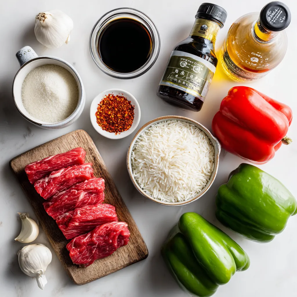 A delicious and crispy beef stir-fry served over fluffy jasmine rice, perfect for a quick dinner.