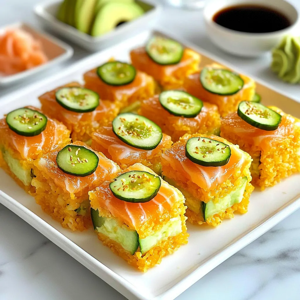 - 2 cups sushi rice - 1/2 pound sushi-grade salmon, diced - 1 ripe avocado, sliced - 1 cucumber, julienned - 1/4 cup rice vinegar - 2 tablespoons sugar - 1 tablespoon salt - Soy sauce, for dipping - 1 cup panko breadcrumbs - 1 tablespoon sesame oil - Wasabi and pickled ginger Crispy rice sushi has simple ingredients that create big flavors. Sushi rice is key. It gives that sticky texture that holds everything together. The sushi-grade salmon adds a fresh taste. Choose ripe avocado for creaminess. Cucumber adds a nice crunch. In your pantry, rice vinegar, sugar, and salt season the rice. These elements balance the flavors well. Soy sauce is a must for dipping. It enhances the taste of every bite. For that crispy outer layer, panko breadcrumbs are perfect. They fry up light and crunchy. A touch of sesame oil adds a nutty note. Don't forget the wasabi and pickled ginger. They bring a spicy kick and freshness. This dish is fun to make. Every element plays an important role. You can easily find these ingredients at your local store. Let's gather them and get cooking! {{ingredient_image_1}} Start by rinsing 2 cups of sushi rice under cold water. You want to keep rinsing until the water runs clear. This step helps remove excess starch. It makes the rice less sticky and gives it a great texture. Next, cook the rice. You can use a rice cooker or a pot. If using a pot, add 2 1/2 cups of water. Bring it to a boil, then cover and simmer for 20 minutes. After cooking, let it sit covered for 10 minutes. While the rice rests, mix 1/4 cup of rice vinegar, 2 tablespoons of sugar, and 1 tablespoon of salt in a bowl. Stir until dissolved. Fold this mixture gently into the rice to season it well. Once the rice is seasoned, spread it onto a baking sheet. Make sure it’s evenly spread out. Let it cool to room temperature. This cooling step is key for shaping. After it’s cool, press the rice into a square or rectangular shape. Aim for about 1/2 inch thick. This helps the rice hold its form when cooking. Chill the pressed rice in the fridge for 30 minutes. This makes it firmer and easier to cut. While the rice chills, preheat a non-stick skillet over medium heat. Add 1 tablespoon of sesame oil to the skillet. This oil adds a nice flavor and keeps the rice from sticking. Cut the chilled rice into bite-sized squares or rectangles. Dredge each piece in 1 cup of panko breadcrumbs. Make sure you coat each piece evenly. Once the skillet is hot, place the coated rice pieces in it. Fry for 2-3 minutes on each side. You want them to be golden brown and crispy. After frying, remove them and place on a paper towel to drain any excess oil. Now it’s time to assemble! Top each crispy rice piece with a slice of sushi-grade salmon, a slice of avocado, and some julienned cucumber. You can add a drizzle of soy sauce on top for extra flavor. Serve these crispy rice sushi pieces right away. Garnish with wasabi and pickled ginger on the side for a nice touch. Enjoy this delightful dish that is sure to impress! To get crispy rice, press it firmly. This helps create a strong base. If you skip this step, the rice may break apart when frying. The frying temperature matters. Heat your skillet to medium. This ensures the rice gets golden brown without burning. If the heat is too low, the rice will be soggy. Too high, and it will burn. To boost flavor, try different sauces. A drizzle of soy sauce adds a nice touch. You can also mix in sriracha for some heat. Don’t forget the garnishes! Green onions or sesame seeds add crunch. You can also toss on some seaweed for an extra layer of taste. When preparing ingredients, slice your veggies ahead of time. This saves you from rushing later. Keep your workspace clean and organized. Use time-saving tools like a sharp knife and cutting board. A rice cooker can make cooking rice easier, too. If you have one, use it! Pro Tips Rinsing the Rice: Always rinse sushi rice thoroughly to remove excess starch. This step is crucial for achieving the perfect texture and preventing the rice from becoming too sticky. Cooling the Rice: Spread the seasoned rice on a baking sheet and let it cool completely before shaping. This helps the rice firm up, making it easier to cut into pieces later. Panko Coating: Make sure to coat the rice pieces evenly with panko breadcrumbs for that extra crunch. A light pressing will help the breadcrumbs adhere better. Serving Fresh: For the best taste and texture, serve the crispy rice sushi immediately after frying. This ensures that the rice remains crispy and the toppings fresh. {{image_2}} You can switch up the main protein in crispy rice sushi. Shrimp, tuna, and crab work great. Each adds a different taste and texture. If you prefer vegetarian options, try tofu or fresh vegetables. Both give a nice crunch and flavor. Want to spice things up? Add some sriracha or spicy mayo for heat. These add a kick to each bite. You can also try incorporating tropical fruits like mango. The sweetness of mango pairs well with the savory elements. Crispy rice sushi can be served in fun ways. You can make mini bites for easy eating. These are perfect for parties or snacks. Another idea is to create combination platters with sushi rolls. This way, you can enjoy a variety of flavors and textures. To keep your crispy rice sushi fresh, store it in an airtight container. Place a piece of parchment paper between the layers to prevent sticking. This method helps keep each piece intact. You can store it in the fridge for up to two days. After that, the texture may change, and it won't taste as great. When you want to enjoy your leftovers, it's best to reheat them in a skillet. Warm the skillet on low heat and add a bit of oil. Place the sushi pieces in the skillet and heat for a few minutes on each side. This method helps keep them crispy. Avoid using a microwave, as it can make the rice soggy and lose its crunch. If you want to save some for later, you can freeze pre-fried rice pieces. Let them coo