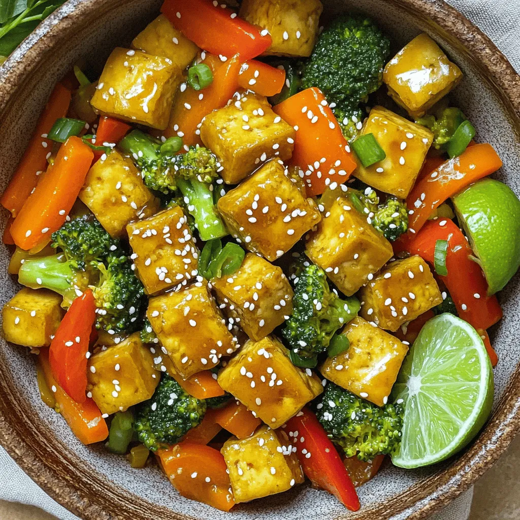 - 1 block (14 oz) firm tofu - 3 tablespoons cornstarch - 3 tablespoons sesame oil - 1 bell pepper (any color) - 1 cup broccoli florets - 1 carrot - 2 green onions - 2 cloves garlic - 1 inch ginger - 3 tablespoons soy sauce (or tamari) - 1 tablespoon honey (or maple syrup) - 1 tablespoon rice vinegar - 1 tablespoon sesame seeds - Salt and pepper to taste Gathering the right ingredients is key to this dish. Start with firm tofu. It holds its shape well and gives you that crispy texture. You will need cornstarch for coating. It creates a crunchy crust when fried. Sesame oil adds a rich, nutty flavor. Choose a bell pepper of any color for a sweet crunch. Broccoli florets add a fresh bite, while a carrot gives a sweet touch. Green onions provide a mild onion flavor. Garlic and ginger add warmth and depth to the dish. For the sauce, soy sauce or tamari brings saltiness and umami. Honey or maple syrup adds a hint of sweetness. Rice vinegar gives a nice tang. Finish with sesame seeds, salt, and pepper for perfect balance. Each ingredient plays an important role in making this meal flavorful and satisfying. First, press the tofu to get rid of extra moisture. Wrap the tofu block in a clean towel. Put a heavy object on top for about 15 minutes. After pressing, cut the tofu into even cubes. Toss the cubes in a bowl with cornstarch. This coating will help the tofu become crispy when cooked. Next, heat 2 tablespoons of sesame oil in a large skillet over medium-high heat. Once the oil is hot, add the coated tofu cubes. Fry the tofu for about 6-8 minutes. Turn the cubes occasionally until they are golden brown and crispy. Once done, remove the tofu from the skillet and set it aside. In the same skillet, add the last tablespoon of sesame oil. Now, add the sliced bell pepper, broccoli florets, and carrot. Stir-fry these vegetables for about 4-5 minutes. You want them tender but still crisp. Then, add the minced garlic and grated ginger. Stir-fry for another 1-2 minutes until they smell great. While the veggies cook, make the sauce. Whisk together soy sauce, honey (or maple syrup), and rice vinegar in a small bowl. After that, return the crispy tofu to the skillet. Pour the sauce over the tofu and vegetables. Stir everything well to coat it evenly. Cook for an extra 2-3 minutes to let the sauce thicken a bit. Taste and add salt and pepper if needed. Finally, sprinkle sesame seeds and chopped green onions before serving. To make your tofu extra crispy, start by pressing it well. Wrap the tofu block in a clean kitchen towel. Place a heavy object on top for 15 minutes. This removes excess moisture. Next, cut the tofu into cubes and coat them with cornstarch. Toss them gently in a bowl until they are evenly covered. This step brings out that perfect crunch when you fry the tofu. For more flavor, you can adjust the seasoning. Add a bit more soy sauce or a dash of chili flakes for heat. You can also swap honey for maple syrup for a vegan option. Feel free to try different veggies too. Snap peas, zucchini, or mushrooms can add unique tastes to your dish. Mix and match based on what you love. When serving, think about how to make it look nice. Garnish your dish with chopped green onions and sesame seeds. This adds a pop of color and texture. You can serve it in a large bowl or on individual plates. For a fresh touch, add a lime wedge on the side. It gives a zesty flavor that brightens the meal. {{image_2}} You can swap out the bell pepper for other veggies. Think about using snap peas, mushrooms, or zucchini. These add unique flavors and textures. Seasonal veggies also work great! In summer, try fresh corn or green beans. In fall, add squash or kale for a cozy twist. If you want to change the protein, tempeh is a great choice. It has a nutty flavor and absorbs sauces well. You can also use seitan for a chewy texture. For a complete meal, serve the stir fry over quinoa. Quinoa is packed with protein and makes it filling. You can make this dish vegan by using maple syrup instead of honey. Tamari is a gluten-free substitute for soy sauce. Want something spicy? Add chili paste or sriracha for a kick. For a sweeter taste, increase the honey or maple syrup for a delightful twist. To keep your crispy sesame tofu stir fry fresh, store leftovers in the fridge. Use an airtight container. This helps keep the tofu crispy and the veggies crunchy. If you want to freeze it, let the stir fry cool first. Place it in a freezer-safe bag or container. Press out as much air as you can before sealing. In the fridge, the stir fry lasts for about 3 to 4 days. Look for changes in color or smell. If the tofu looks off or smells sour, it’s time to toss it. Fresh veggies will also lose their bright colors and crispness. To reheat without losing texture, use a stovetop. Heat a pan over medium heat and add a splash of water. This helps steam the veggies and keeps the tofu crisp. Stir gently until warmed through. If you use a microwave, place the stir fry in a bowl and cover it. Heat in short bursts, stirring in between. This method helps prevent sogginess. Yes, you can make this dish ahead of time. Here are some best practices for meal prep: - Prepare the tofu: Press and cube the tofu. Coat it in cornstarch. - Store vegetables: Chop the bell pepper, broccoli, and carrot. Keep them in a container. - Make the sauce: Mix the soy sauce, honey, and rice vinegar. Store in the fridge. - Cooking: When ready to eat, fry the tofu and stir-fry the veggies. Add the sauce at the end for fresh flavor. Yes, this recipe is vegan-friendly. Here’s the ingredient breakdown: - Tofu: Made from soybeans, it's a great protein source. - Cornstarch: A plant-based thickener for the crispy texture. - Sesame oil: Adds rich flavor and is plant-based. - Soy sauce: Usually vegan, but check for brands without animal products. - Honey or maple syrup: Use maple syrup to keep it fully vegan. - Vegetables: All included veggies are plant-based and healthy. This stir fry pairs