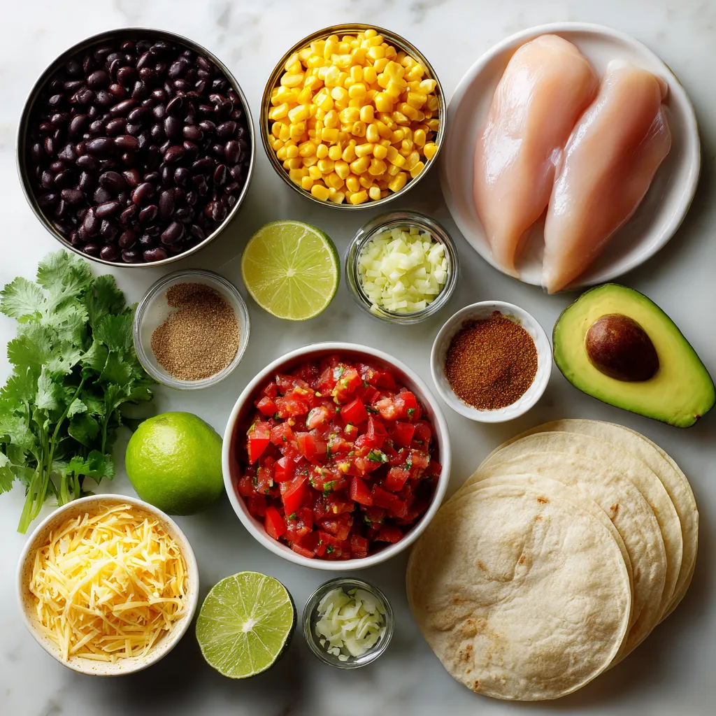 - 1.5 lbs boneless, skinless chicken breasts - 1 can (15 oz) black beans, rinsed and drained - 1 can (15 oz) corn, drained - 1 can (10 oz) diced tomatoes with green chilies The base of my crockpot chicken tacos is simple yet full of flavor. I always start with boneless, skinless chicken breasts. They cook well and shred easily. Next, I add black beans and corn. They bring a hearty texture and add fiber. Diced tomatoes with green chilies give a nice kick. The juice from these tomatoes keeps everything moist and tasty. - 2 tablespoons taco seasoning - 1 teaspoon cumin - Juice of 1 lime - Fresh cilantro, for garnish - Optional toppings: Avocado slices, shredded cheese Seasonings are key in this dish. Taco seasoning and cumin add depth to the chicken. A squeeze of lime juice brightens the flavors. Once the tacos are ready, I like to top them with fresh cilantro. It adds a pop of color and taste. For a richer bite, I recommend adding avocado slices or shredded cheese. These toppings make the meal even more satisfying. {{ingredient_image_1}} To make your crockpot chicken tacos, start by layering your ingredients. Place the boneless, skinless chicken breasts at the bottom of the crockpot. This helps the chicken stay moist. Next, add the finely chopped onion and minced garlic over the chicken. Then, add the rinsed black beans, drained corn, and diced tomatoes with their juice on top. For chopping, use a sharp knife for even pieces. This helps all the flavors mix well. Measure the taco seasoning and cumin carefully. A good balance of spices makes your dish pop with flavor. Set your crockpot to low for a long, slow cook. This allows the chicken to become very tender. You can also set it to high if you are short on time. Cooking on low takes about 6 to 8 hours. If you choose high, it will only take 3 to 4 hours. Just make sure the chicken reaches an internal temperature of 165°F. Once the chicken is cooked, it’s time to shred it. Use two forks to pull the chicken apart easily. You can also use a hand mixer for quicker shredding. After shredding, mix the chicken back into the sauce in the crockpot. For serving, warm your tortillas in a pan for a few seconds. Fill each tortilla with the chicken mixture. Top with fresh cilantro, avocado slices, and shredded cheese if you like. Enjoy your savory tacos! To keep your chicken tender, use boneless, skinless breasts. They cook evenly and stay juicy. Add lime juice before cooking. This will help tenderize the meat. Make sure not to overcook it. When chicken is dry, it loses flavor. Adjusting seasoning is easy. After cooking, taste the mixture. If it needs more spice, sprinkle in extra taco seasoning. Add a pinch of salt to bring out the flavors. You can also stir in fresh cilantro for a burst of freshness. Preparing your ingredients ahead of time saves you hassle. Chop the onion and garlic the night before. You can even mix the taco seasoning with the other spices early. This way, everything is ready to go when you start cooking. Shredding chicken can take time, but there are quick methods. Use two forks to shred it in the crockpot. If you're short on time, try using a hand mixer. Just be careful not to over-shred; you want it chunkier, not mushy. Pro Tips Choosing the Right Chicken: Opt for organic or free-range chicken for better flavor and texture. Customize Your Spice Level: Adjust the amount of taco seasoning and add jalapeños if you like it spicy. Prep Ahead: You can prepare the ingredients the night before and store them in the fridge for a quick morning prep. Serving Suggestions: Serve with lime wedges on the side for a zesty kick and extra fresh cilantro for garnish. {{image_2}} You can switch up the beans in this dish. Try pinto beans or chickpeas for a new taste. You can also add more veggies. Bell peppers, zucchini, or spinach work well. For a dairy-free option, skip the cheese. Use guacamole or a dairy-free sour cream instead. Want to add some heat? Toss in sliced jalapeños to the slow cooker. They will bring a nice kick. You can also use other spices for more flavor. Try smoked paprika or chili powder. These spices will elevate the taste of your tacos. Experimenting with spices is a fun way to make this dish your own! Store leftovers in an airtight container. This keeps the chicken moist and fresh. Place the chicken mixture in the fridge within two hours of cooking. It lasts up to three days in the fridge. Before serving, check for any off smells or changes in texture. To freeze the chicken mixture, let it cool completely first. Transfer it to a freezer-safe bag. Remove as much air as possible and seal it tightly. You can freeze it for up to three months. When ready to eat, thaw it overnight in the fridge. For reheating, place the mixture in a pot over low heat. Stir until it’s warmed through. You can also use the microwave, heating in short bursts. Stir in between to avoid hot spots. Serve it with fresh tortillas and toppings for a quick meal. Can I use frozen chicken breasts? Yes, you can use frozen chicken breasts. Just add an extra hour to the cooking time. This will help ensure it cooks through safely. I often use frozen chicken for quick meals. It saves time and still tastes great. What type of tortillas are best for serving? Corn tortillas work best for these tacos. They have a nice flavor and hold up well. You can also use flour tortillas if you prefer a softer bite. Just warm them before filling for the best taste. How can I make this recipe spicier? To spice it up, add sliced jalapeños or extra taco seasoning. Chipotle powder is another great choice for a smoky heat. You can also serve with hot sauce to let everyone add their own spice. Caloric breakdown per serving Each serving has about 300 calories. This makes it a tasty and filling meal without being too heavy. Key nutrients in the recipe This dish is rich in protein from the chicken and beans. It also has fiber from the black beans and corn. Plus, tomatoes add vitamins A 