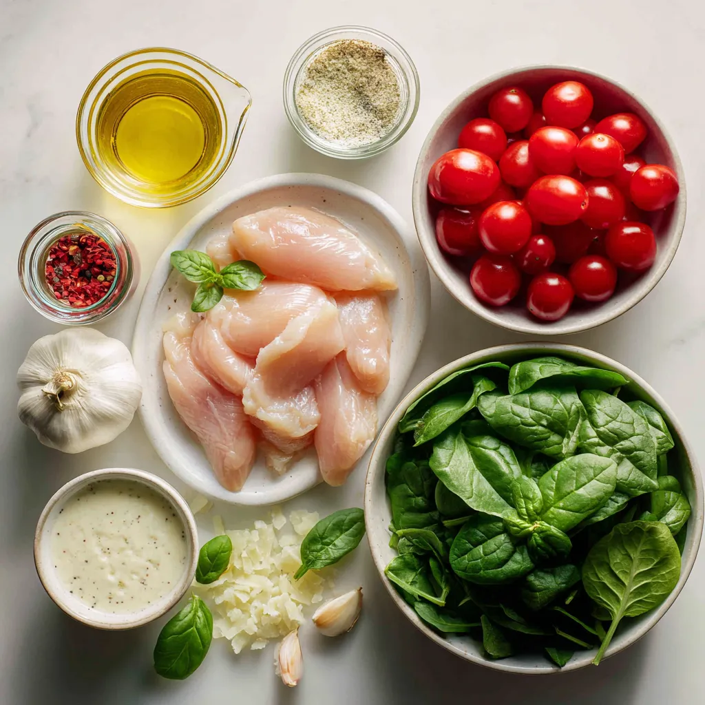To start, gather all your ingredients. You need four boneless, skinless chicken breasts, one cup of cherry tomatoes, and one cup of baby spinach. You will also need one medium onion, four cloves of garlic, one cup of heavy cream, and one cup of chicken broth. Don’t forget two teaspoons of Italian seasoning and one teaspoon of red pepper flakes if you want some heat. Finally, grab one cup of grated Parmesan cheese, salt, and pepper for taste, plus fresh basil for that lovely garnish.