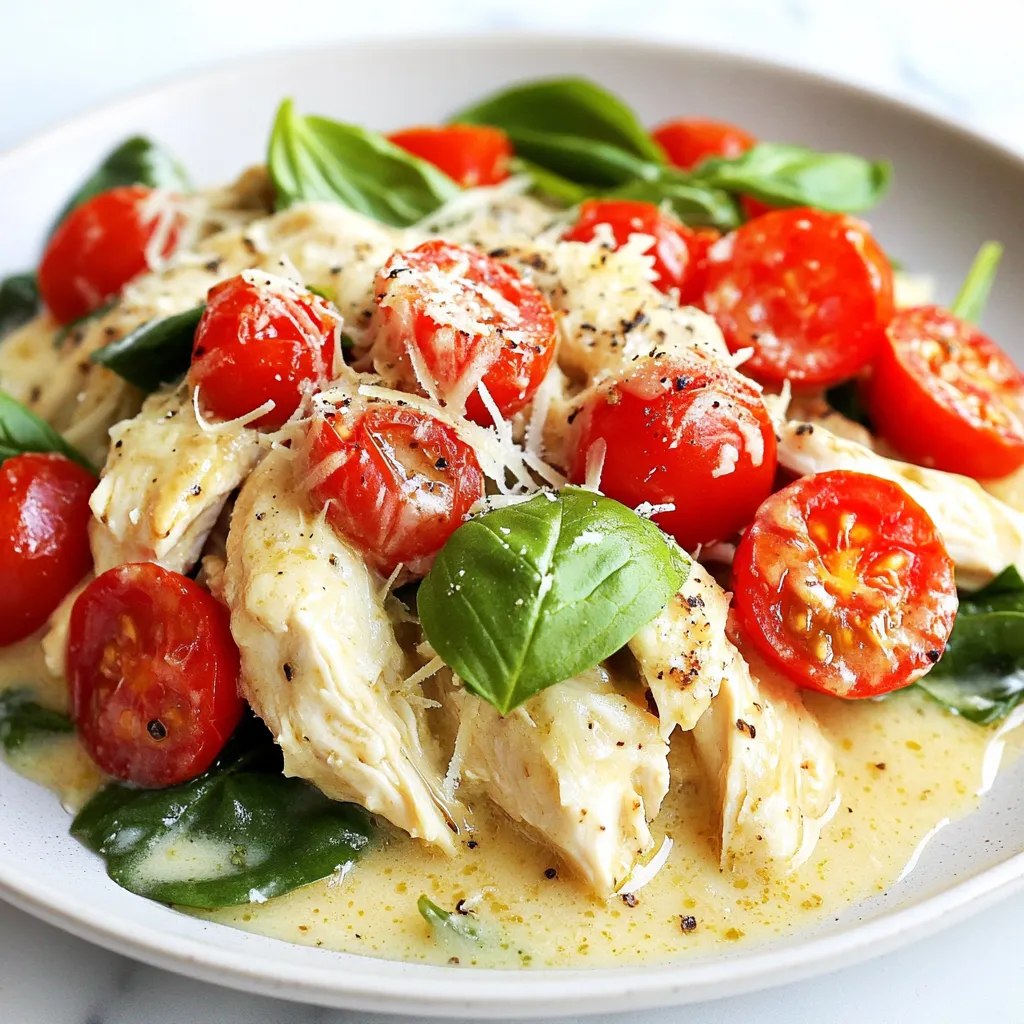 A creamy and flavorful chicken dish cooked slowly in a crockpot with tomatoes, spinach, and Parmesan cheese.