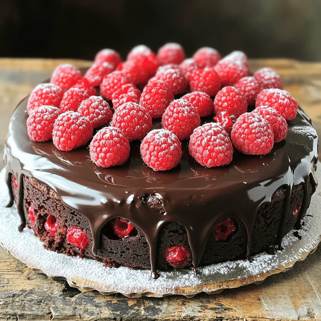 - 1 cup all-purpose flour - 1/2 cup unsweetened cocoa powder - 1 cup granulated sugar - 1/2 teaspoon baking powder - 1/2 teaspoon baking soda - 1/4 teaspoon salt - 1/2 cup unsalted butter, melted - 2 large eggs - 1 teaspoon vanilla extract - 1/4 cup buttermilk For the cake, I use all-purpose flour to give it a light texture. Unsweetened cocoa powder adds rich chocolate flavor. Granulated sugar sweetens the cake well. Baking powder and baking soda help it rise. Salt brings out all the flavors. I melt unsalted butter for a smooth batter. Eggs help bind everything together. Vanilla extract adds warmth, and buttermilk keeps it moist. - 8 oz dark chocolate (70% cocoa), chopped - 1/2 cup heavy cream - 1 cup fresh raspberries - Powdered sugar for dusting For the truffle topping, I choose dark chocolate with 70% cocoa. It gives a deep, rich taste. Heavy cream creates the perfect creamy texture. Fresh raspberries add a burst of flavor and a pop of color. I use powdered sugar for a light dusting to make it look pretty. These ingredients transform the cake into a delightful dessert. - Preheat your oven to 350°F (175°C). - Grease a 9-inch round cake pan with butter or oil. - Line the bottom of the pan with parchment paper. This helps with easy removal. - In a large bowl, combine the dry ingredients: flour, cocoa powder, sugar, baking powder, baking soda, and salt. - In another bowl, mix the wet ingredients: melted butter, eggs, vanilla extract, and buttermilk. - Pour the wet mixture into the dry ingredients. Stir gently until just combined. - Be careful not to overmix; this keeps the cake fluffy. - Next, fold in the fresh raspberries gently, spreading them evenly in the batter. - Pour the batter into the prepared cake pan. Smooth the top. - Bake for 25-30 minutes. Check with a toothpick; it should come out clean. - Cool the cake in the pan for 10 minutes, then move it to a wire rack to cool completely. - While the cake cools, heat the heavy cream in a saucepan over medium heat. - Watch for it to just start simmering, then remove it from the heat. - Add the chopped dark chocolate to the cream. Let it sit for a few minutes, then stir until smooth. - Once cooled, place the cake on a serving plate. - Pour the dark chocolate truffle topping over it, letting it drizzle down the sides. - Chill the cake in the fridge for 20-30 minutes. This firms up the topping. - Before serving, dust the top with powdered sugar for a nice touch. - Slice the cake and enjoy this delightful treat! - Avoiding overmixing for fluffy texture: When you mix the wet and dry ingredients, stir gently. Overmixing can make the cake dense. You want it light and airy. Stop when you see no more dry flour. - Ensuring the cake is fully baked: Always check the cake with a toothpick. Insert it in the center. If it comes out clean, the cake is ready. If it has batter on it, bake a few more minutes. - Achieving a smooth truffle topping: Heat the cream until it simmers, then remove from heat before adding the chocolate. Let it sit for a few minutes. Stir until smooth and shiny. This gives you a rich topping. - Alternatives to heavy cream: You can use coconut cream for a dairy-free option. It will change the flavor slightly but still tastes great. You can also try using almond milk for a lighter topping. - Pairing with ice cream or whipped cream: This cake pairs well with vanilla ice cream or fresh whipped cream. The cold cream balances the rich chocolate flavor nicely. - Presentation ideas for special occasions: For a stunning look, add fresh raspberries on top. Dust with powdered sugar for a pretty finish. You can also use mint leaves for a pop of color. {{image_2}} You can change the chocolate type for the truffle cake. Try using milk chocolate or white chocolate instead of dark chocolate. Milk chocolate brings a creamier taste, while white chocolate adds sweetness. Adjust the sugar in the recipe based on your choice. For a fun twist, mix different chocolates. Each option creates a unique flavor. While raspberries are delightful, you can explore other fruits. Strawberries, blueberries, or cherries work well too. Each fruit gives a fresh taste. You can even mix berries for a colorful cake. For added flavor, add a few drops of flavored extracts. Almond or orange extracts enhance the cake's taste and make it special. If you need gluten-free options, swap the all-purpose flour with gluten-free flour. Many brands work well in baking. For those following a vegan diet, replace eggs with flax eggs or applesauce. Use plant-based butter and non-dairy cream for the topping. These swaps keep the cake delicious while meeting dietary needs. To keep your leftover cake fresh, wrap it well. Use plastic wrap or foil. Place it in the fridge. This helps prevent it from drying out. The cake stays good for about 3 to 4 days in the fridge. If you want to enjoy it later, slice it into pieces. This makes it easier to grab a slice when you want one. Just remember, the fresher the cake, the better it tastes! If you want to freeze the cake, start by wrapping it tightly. Use plastic wrap and then aluminum foil. This keeps air out and helps avoid freezer burn. Label the cake with the date. You can freeze it for up to 3 months. When you are ready to eat it, take it out of the freezer. Let it thaw in the fridge overnight for best results. This keeps the cake moist and tasty. If you're in a hurry, you can thaw it at room temperature for about 2 hours. Enjoy it fresh, just like when you first made it! Yes, you can use frozen raspberries. They work well in this cake. Just remember to thaw them first. Drain any extra juice to avoid a soggy cake. Gently fold them into the batter. This way, they stay whole and add great flavor. To get a glossy truffle topping, heat the heavy cream until it simmers. Remove it from the heat and add the chopped dark chocolate. Let it sit for a few minutes. Then stir until smooth. This method helps the chocolate melt evenly, giving it that shiny look