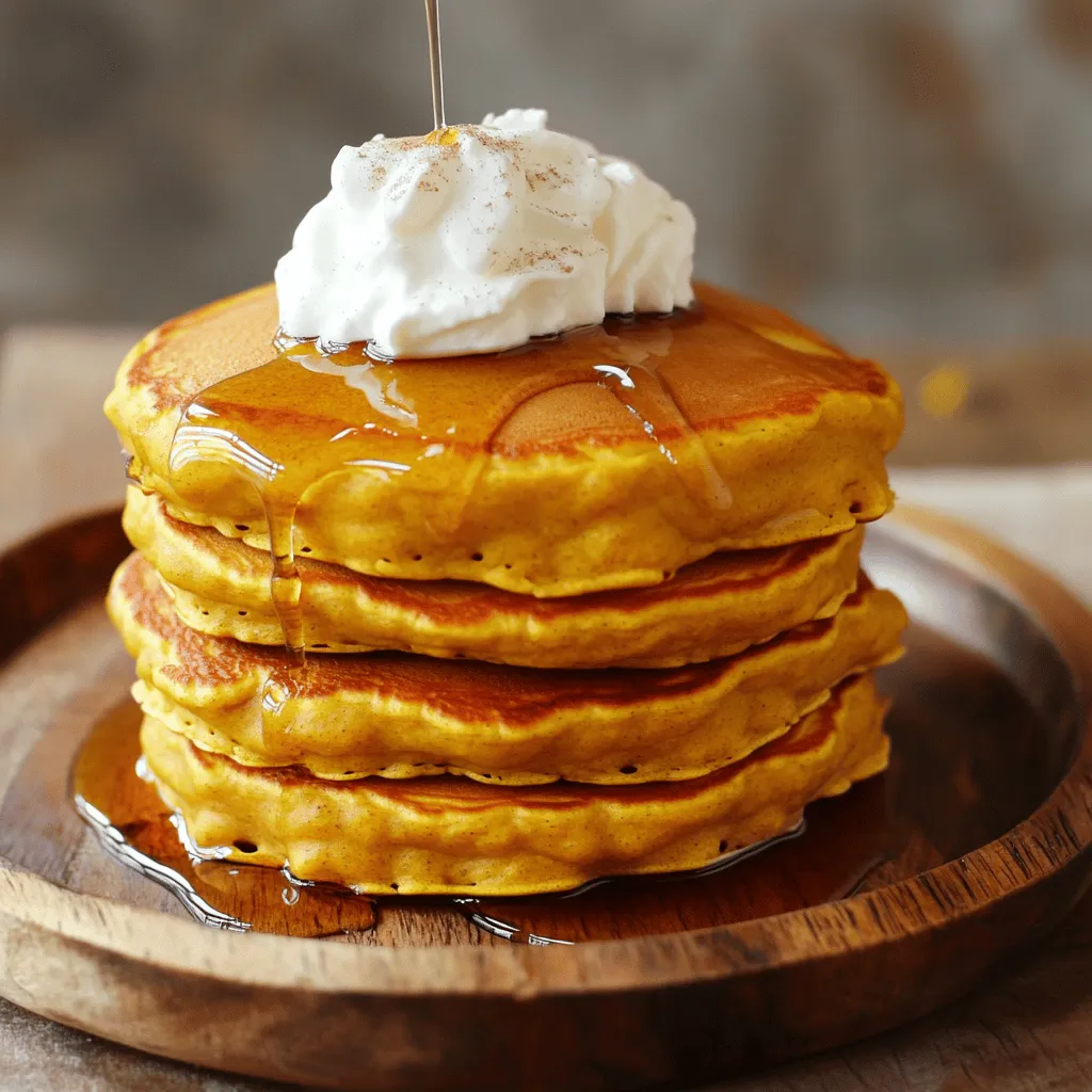 - 1 cup all-purpose flour - 2 tablespoons sugar - 1 tablespoon baking powder - 1/2 teaspoon cinnamon - 1/4 teaspoon nutmeg - 1/4 teaspoon ginger - 1/2 teaspoon salt - 1 cup milk - 1/2 cup pumpkin puree - 1 large egg - 2 tablespoons cream cheese, softened - 1 teaspoon vanilla extract - Butter or oil for cooking When measuring flour, use a spoon to fill your cup. This keeps it light and fluffy. Level it off with a knife. For liquids, use a clear measuring cup. Look at the measurement at eye level. This ensures you get the right amount. If you're out of all-purpose flour, try whole wheat flour. It adds a nutty taste. You can swap milk with almond or oat milk for a dairy-free option. If you need a pumpkin puree substitute, use mashed banana or applesauce. You can also use Greek yogurt instead of cream cheese for a lighter touch. Start with a large mixing bowl. Add 1 cup of all-purpose flour. Then, mix in 2 tablespoons of sugar. Next, add 1 tablespoon of baking powder. Sprinkle in 1/2 teaspoon of cinnamon, 1/4 teaspoon of nutmeg, and 1/4 teaspoon of ginger. Finally, add 1/2 teaspoon of salt. Whisk these dry ingredients together until they are well combined. This step is key for flavor. It also helps the pancakes rise nicely. In a separate bowl, pour in 1 cup of milk. Add 1/2 cup of pumpkin puree to the milk. Crack in 1 large egg and add 2 tablespoons of softened cream cheese. Finish with 1 teaspoon of vanilla extract. Whisk this mixture until it is smooth and creamy. The cream cheese adds a rich flavor. It also makes the pancakes soft and tender. Preheat a non-stick skillet or griddle to medium heat. Add a little butter or oil to the pan. For each pancake, pour about 1/4 cup of batter onto the skillet. Cook until bubbles form on the surface. This usually takes about 3-4 minutes. The edges should look set. Carefully flip the pancakes and cook for another 2-3 minutes until golden brown. Remove them from the skillet and keep warm. Repeat this process until you finish all the batter. Serve warm with your favorite toppings. To make your pancakes fluffy, use fresh baking powder. Old baking powder can cause flat pancakes. Mix your dry ingredients well. This ensures even rising. When adding wet to dry, stir just until combined. This way, your pancakes stay light and airy. Overmixing is a common mistake. It makes pancakes tough. When you mix the batter, do it gently. A few lumps are fine. The goal is to keep air in the batter. This air helps pancakes rise and stay fluffy. Cook pancakes on medium heat. Too high can burn them. Too low can make them soggy. Preheat your skillet before pouring in the batter. Once you see bubbles on the surface, it’s time to flip them. This helps achieve that golden brown color we all love. {{image_2}} For the best taste, I love to top my pancakes with: - Warm maple syrup - Fluffy whipped cream - A sprinkle of cinnamon - Chopped pecans or walnuts - Fresh berries for a fruity twist These toppings add flavor and texture. Maple syrup brings sweetness, while whipped cream adds creaminess. Cinnamon gives a warm spice note, and nuts add a nice crunch. These pancakes shine when paired with: - A side of crispy bacon - A fresh fruit salad - A cup of hot coffee or tea - A dollop of yogurt Crispy bacon gives a salty touch, balancing the sweetness. Fresh fruit adds brightness, and coffee or tea enhances the warm flavors. Yogurt offers creaminess and some tang. I recommend serving about two to three pancakes per person. This allows you to enjoy the rich flavors without feeling too full. If you have guests, stack them high on a plate. Everyone loves a big pile of pancakes! You can make these pumpkin cheesecake pancakes gluten-free. Use gluten-free flour instead of all-purpose flour. Many brands offer blends that work well for pancakes. Just make sure to check the packaging for any specific instructions. The taste and texture will stay delightful, and you'll enjoy a fluffy bite. To create a vegan version, swap the egg for a flax egg. Mix one tablespoon of ground flaxseed with three tablespoons of water. Let it sit for five minutes to thicken. Replace milk with almond or oat milk. Use a vegan cream cheese alternative in place of regular cream cheese. These changes keep the pancakes rich and tasty. Add spices for extra depth! Try a pinch of cloves or allspice for a warm kick. You can also mix in chocolate chips for a fun twist. Another idea is to add chopped nuts for crunch. Top with a dollop of whipped coconut cream for a tropical flair. Each enhancement makes the pancakes even more exciting. To store leftover pancakes, let them cool first. Place them in a stack, with parchment paper between each pancake. Then, put them in an airtight container. You can keep them in the fridge for up to three days. If you want them to last longer, freeze them instead. Yes, you can freeze pancakes. Once they cool, stack them with parchment paper in between. Wrap the stack in plastic wrap or foil. Then, place them in a freezer-safe bag. They will stay good for about one month. To reheat, just pop them in the toaster or microwave. If you don't have pumpkin puree, you can use applesauce. It gives a nice sweetness and moisture. You can also use mashed bananas, which add flavor. Another option is butternut squash puree; it works well too. Make sure to keep the same amount as the recipe calls for. You learned about key ingredients, mixing steps, and cooking tips for pancakes. I shared helpful advice on fluffiness, cooking temps, and serving ideas. You explored variations for gluten-free and vegan diets. This guide aims to simplify pancake making for you. Now, you can create delicious, homemade pancakes that suit your tastes and needs. Enjoy your cooking adventures and let your creativity shine with these recipes!