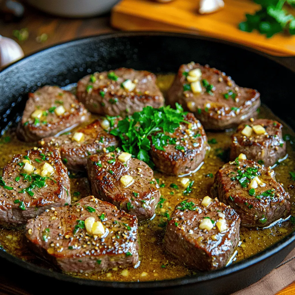 Now, toss the steak bites back into the skillet. Make sure they are fully coated in the garlic butter sauce. Cook for another minute. This allows the flavors to meld beautifully. For serving, you can use a cast-iron skillet for a rustic look. A wooden cutting board is also great. Add toothpicks or skewers for easy eating. Finally, garnish with fresh parsley for a pop of color.Enjoy making this juicy and flavorful dish!