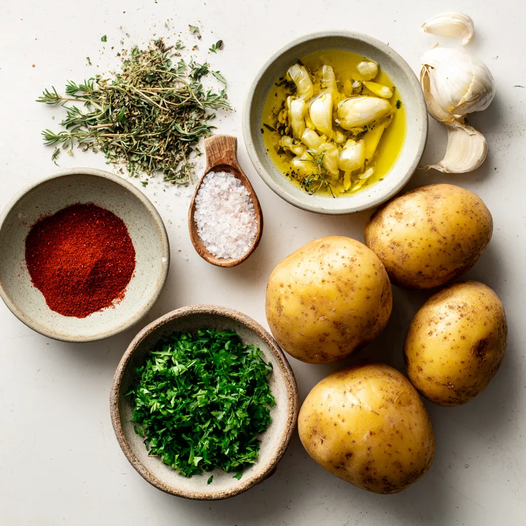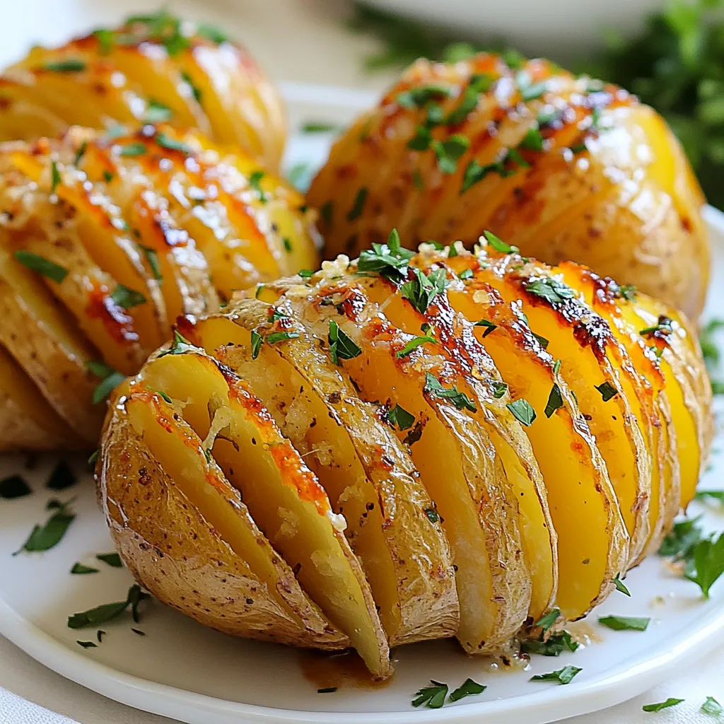 The key ingredients for Garlic Herb Hasselback Potatoes shine with flavor and texture. The russet potatoes are perfect for this dish. Their starchy nature makes them crispy outside and fluffy inside.