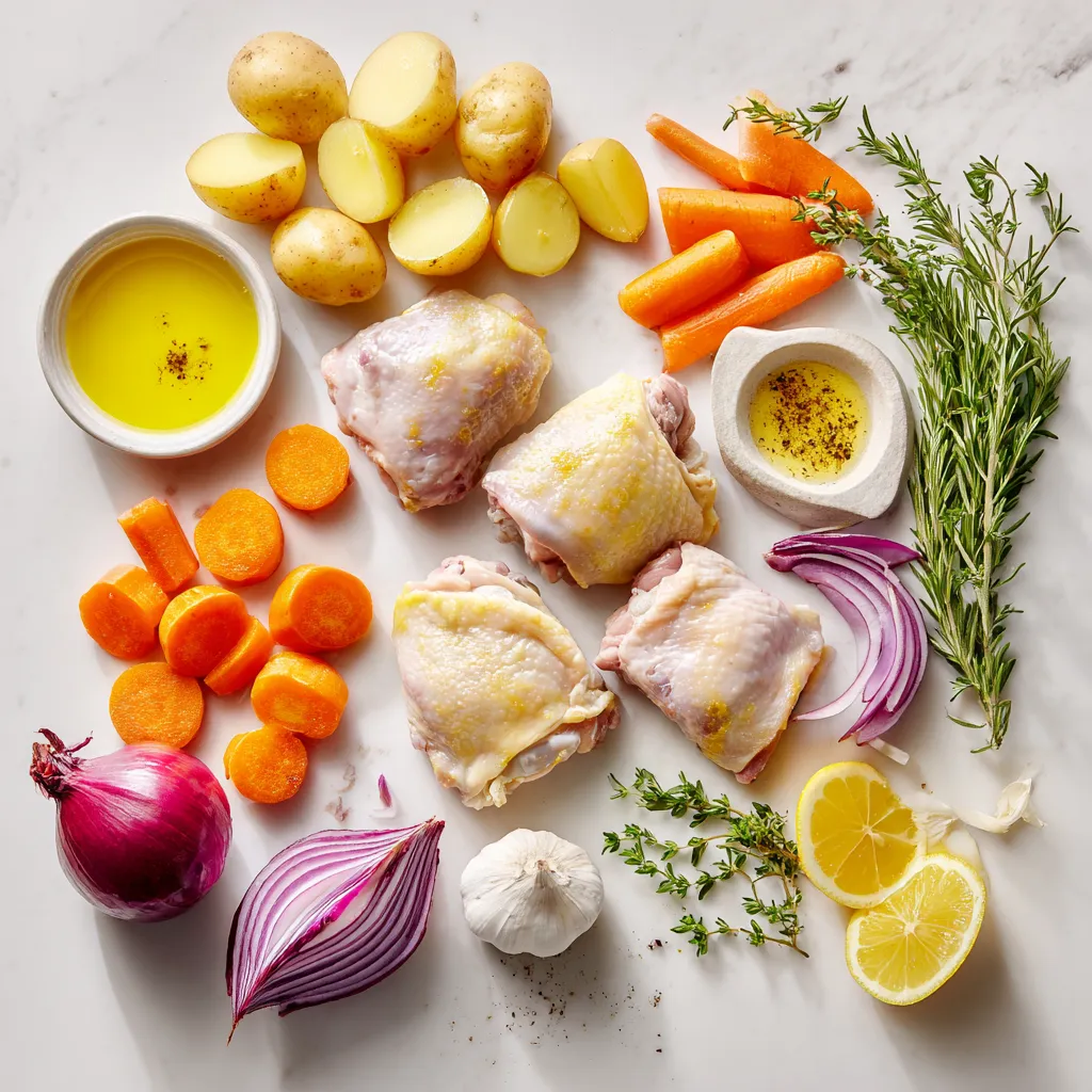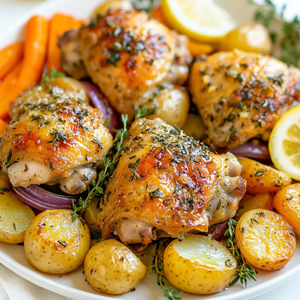 I love using chicken thighs. They stay juicy and flavorful. Baby potatoes bring a nice texture, and carrots add sweetness. Red onion gives a lovely depth to the dish. Fresh garlic and herbs brighten the flavors.