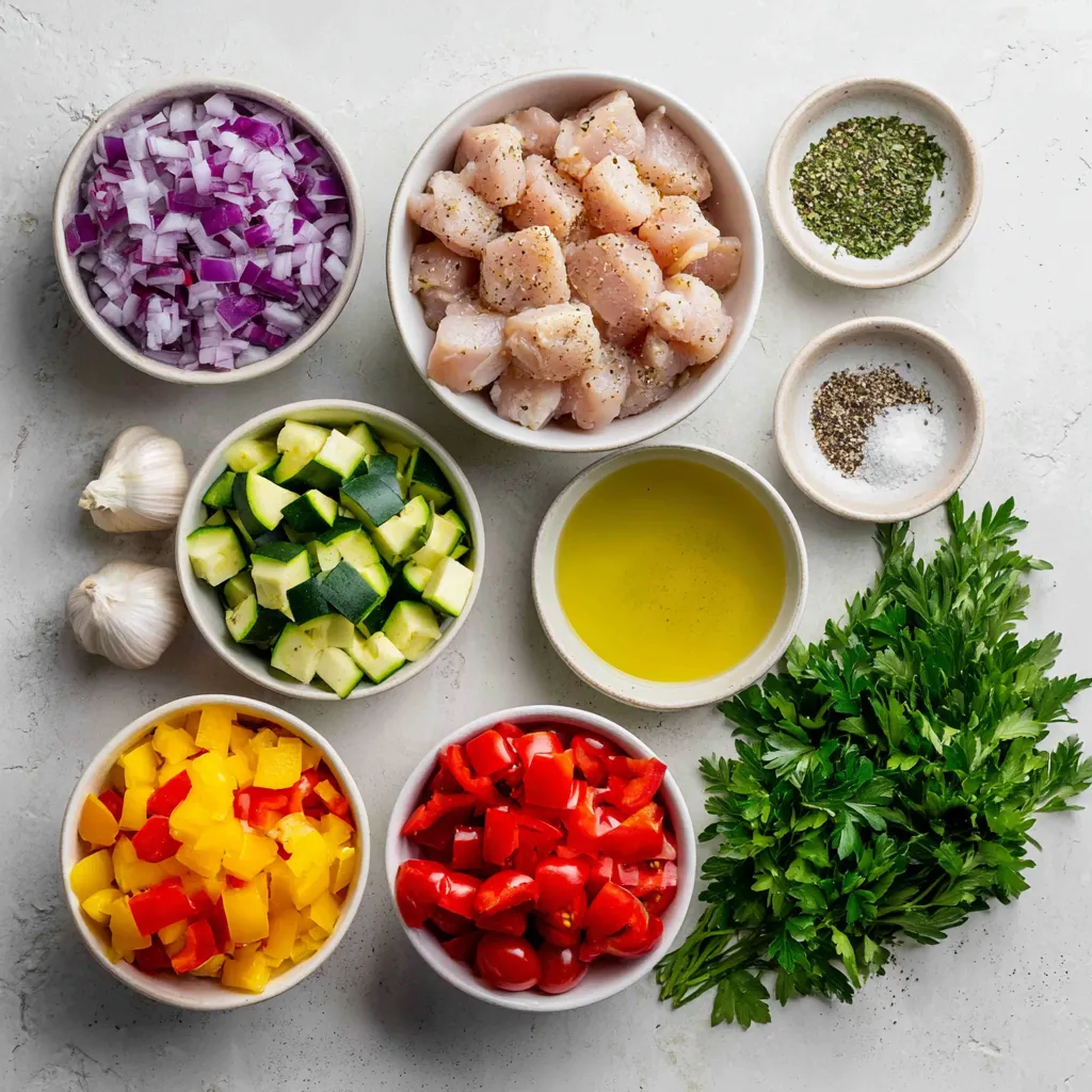These ingredients come together to create a tasty and vibrant dish. The chicken thighs give a rich flavor, while the veggies add color and nutrition. You can pick any bell pepper to match your taste. The cherry tomatoes burst with juice and sweetness. Fresh parsley at the end brightens the dish and makes it look nice.