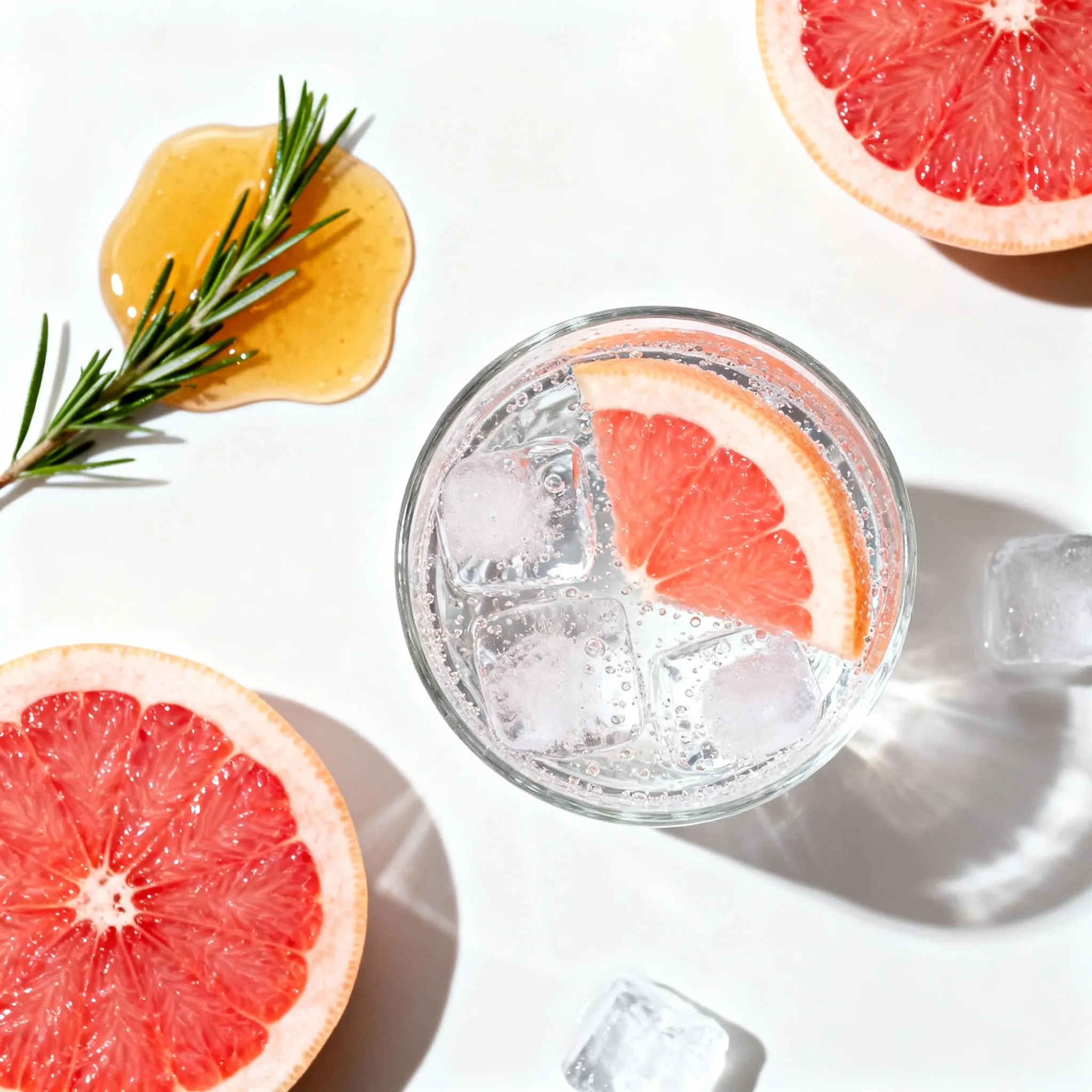 A refreshing and bubbly drink combining grapefruit juice and rosemary, perfect for warm days.