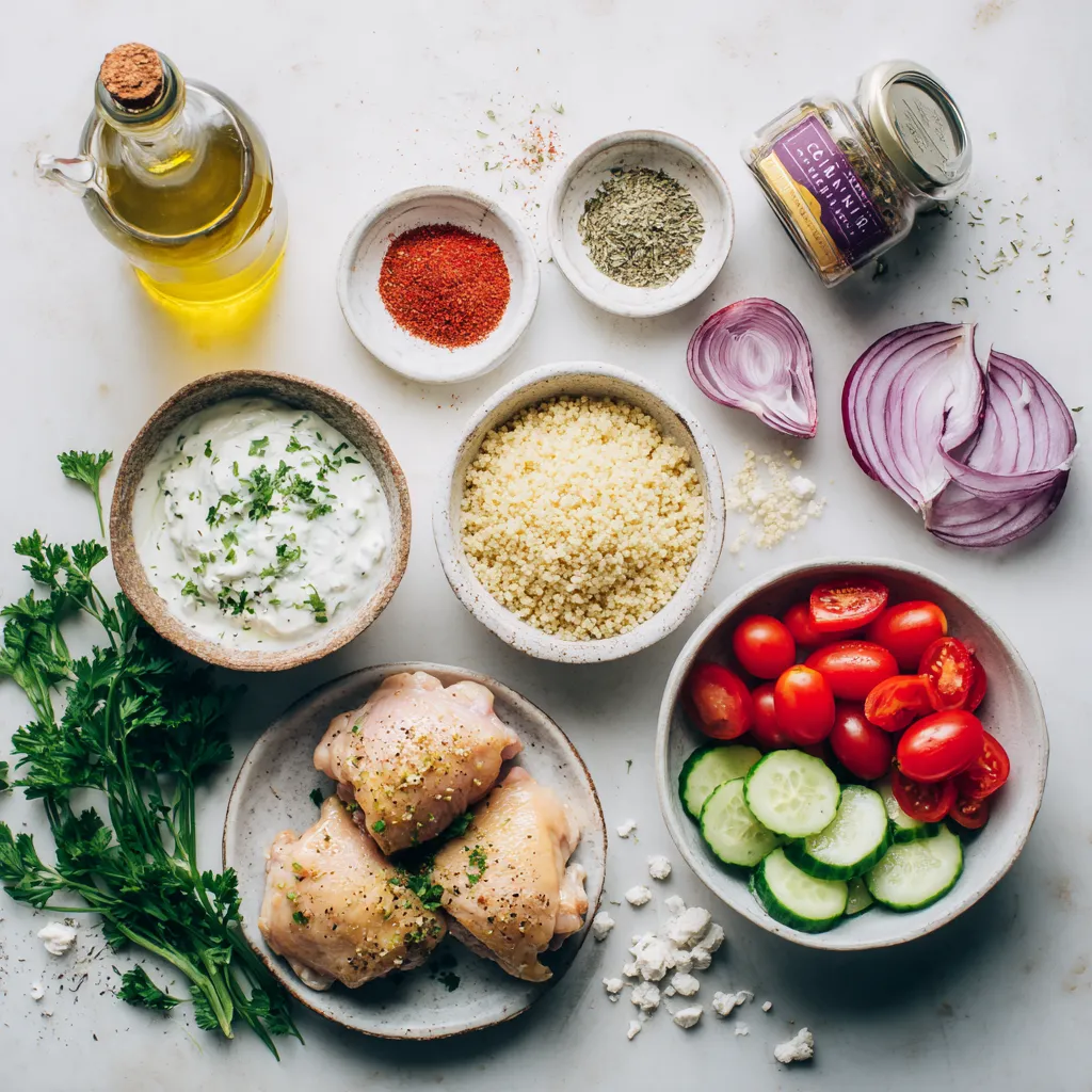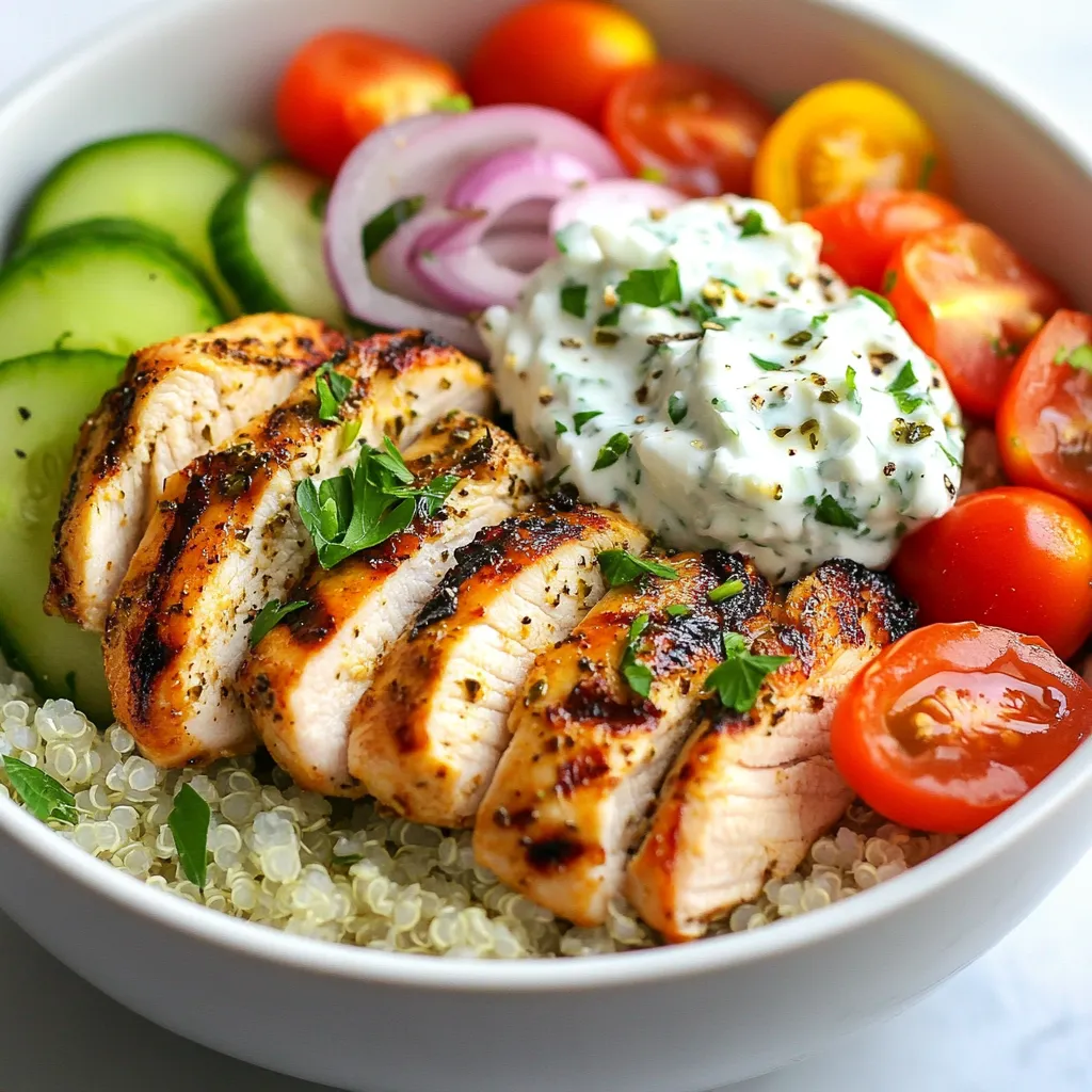 A delicious and healthy bowl featuring marinated chicken, fresh vegetables, and tzatziki sauce.