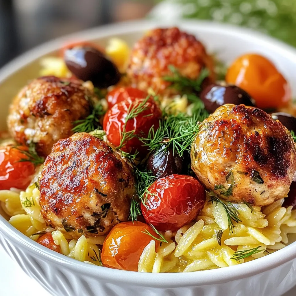 A delicious and fresh dish featuring chicken meatballs infused with Greek flavors served over lemony orzo.