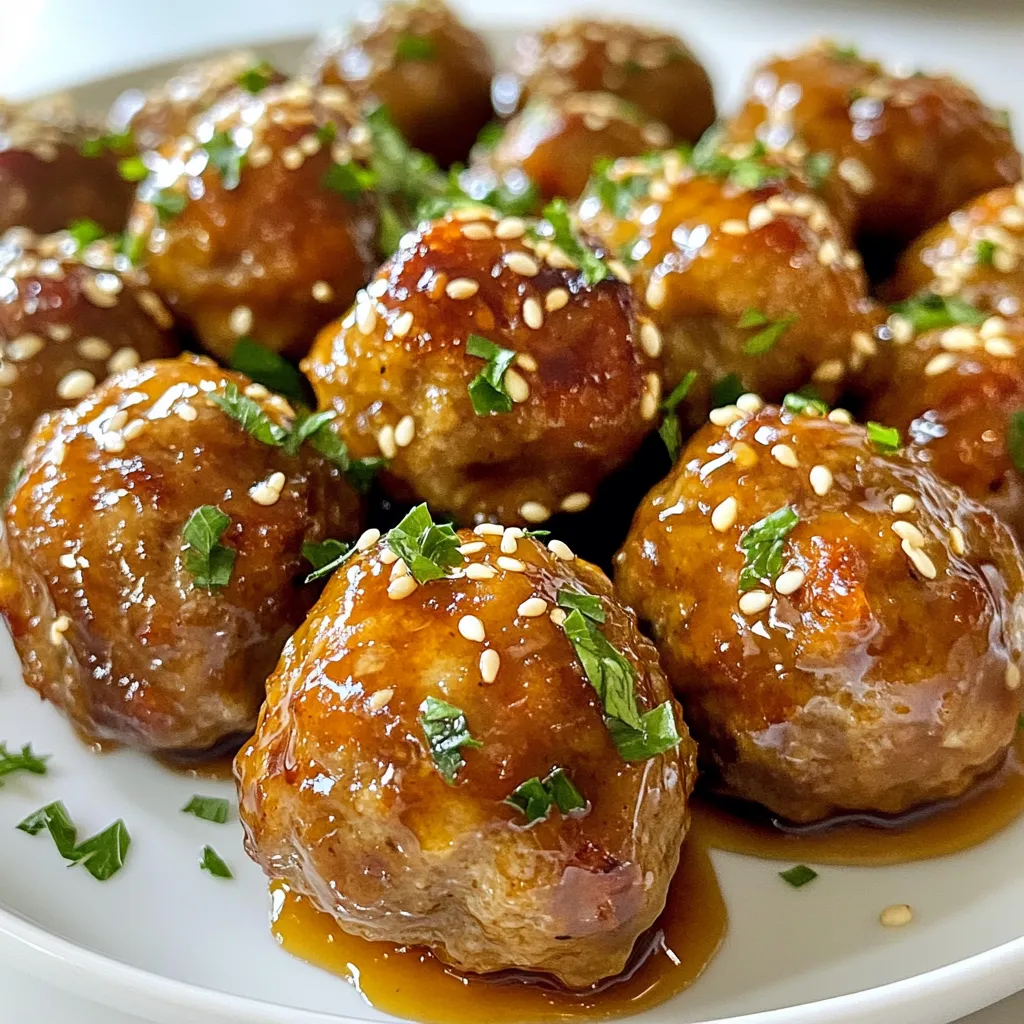 Now, arrange the glazed meatballs on a serving platter. If you like, drizzle any leftover glaze on top. Garnish with sesame seeds and fresh herbs for a pop of color. Enjoy your delicious creation!