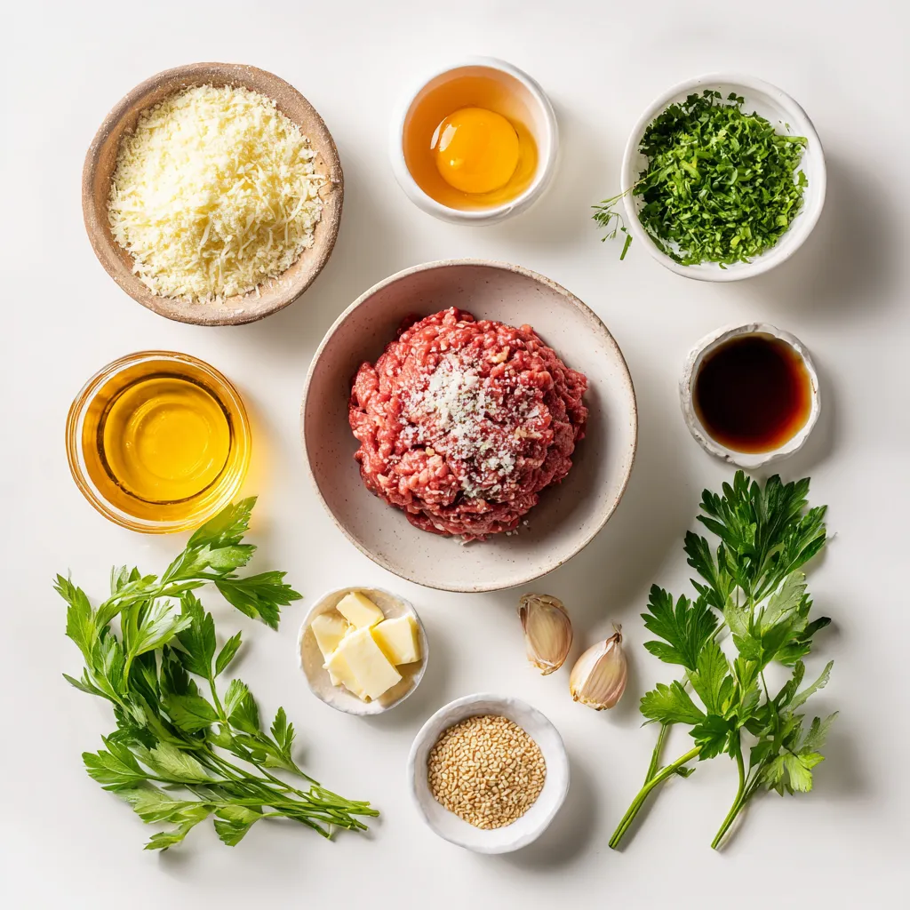 In a large bowl, mix together the ground beef, breadcrumbs, and grated Parmesan cheese. Add the chopped parsley, beaten egg, minced garlic, onion powder, salt, and black pepper. Use your hands to combine all the ingredients well.