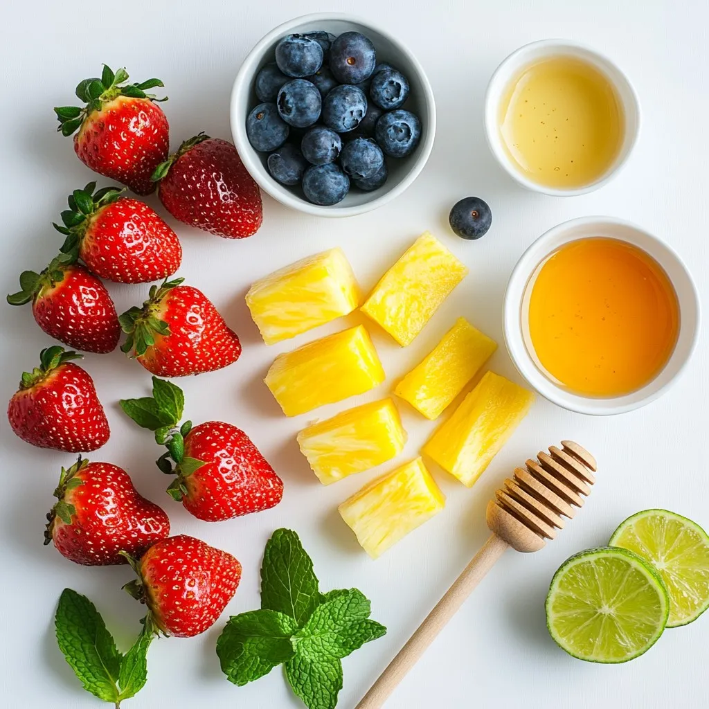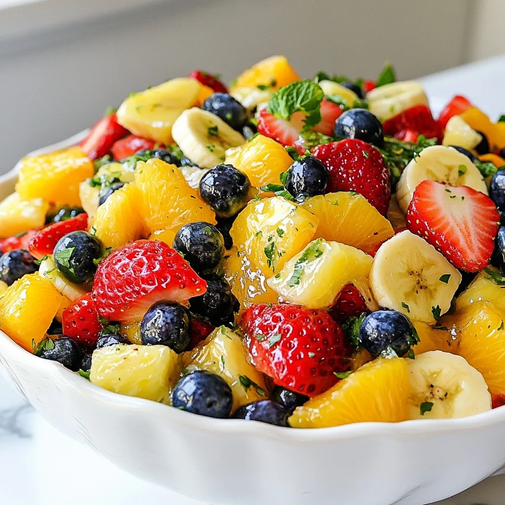 For the Honey Lime Fruit Salad, I use a mix of fresh fruits to bring flavor and color. Here’s what you need: - 2 cups strawberries, hulled and sliced - 1 cup blueberries - 2 cups pineapple, diced - 2 oranges, segmented - 1 ripe banana, sliced These fruits provide a sweet and tangy taste. They also add a bright look to the dish. The dressing is simple but makes a big difference. You will need: - 3 tablespoons honey - 2 tablespoons lime juice - Zest of 1 lime - Pinch of salt This dressing gives the salad a sweet and zesty flavor that enhances the fruits. To make your salad even better, consider adding: - 1 tablespoon fresh mint, finely chopped Mint adds a fresh taste and a lovely aroma. You can also try other herbs or nuts for more texture and flavor. {{ingredient_image_1}} Start by washing all the fruits. Rinse the strawberries and blueberries under cool water. Hull the strawberries and slice them into thin pieces. Next, take the pineapple and cut it into small cubes. For the oranges, gently segment them to avoid breaking the pieces. Lastly, slice the ripe banana. Place all the prepared fruits in a large mixing bowl. You want a colorful mix that looks great! In a small bowl, add three tablespoons of honey. Squeeze in two tablespoons of fresh lime juice. Grate the zest of one lime and add it to the bowl. Finally, sprinkle in a pinch of salt. Use a whisk to mix everything until it’s smooth and well combined. This dressing brings a sweet and tangy flavor to the fruit. Now it's time to bring it all together. Drizzle your honey-lime dressing over the fruit mixture. Gently toss the fruits so they all get coated with the dressing. Be careful not to mash the fruit. After mixing, add the finely chopped mint for a fresh touch. Give it one last gentle toss. You can serve it right away or chill it for 15-30 minutes. This lets the flavors blend beautifully! Choosing ripe fruits makes your salad shine. Look for strawberries that are bright red and firm. For blueberries, pick ones that are plump and have a deep color. Choose pineapples that smell sweet and feel slightly soft. Oranges should be heavy for their size and have smooth skin. Bananas should be yellow with a few brown spots for sweetness. Serve your Honey Lime Fruit Salad in a big bowl. You can also use small cups for easy serving. If you want to impress, add a sprig of mint on top. This adds color and a fresh smell. This salad is great for breakfast, snacks, or parties. You can also serve it with yogurt for extra creaminess. Want to boost the taste? Add a handful of nuts for crunch. Chopped walnuts or almonds work well. You can also add a splash of coconut milk for a tropical touch. If you like spice, sprinkle a little chili powder for a kick. A pinch of cinnamon can add warmth too. These extras make the salad even more exciting! Pro Tips Choose Ripe Fruits: Make sure all fruits are ripe and in season for the best flavor and sweetness. Mixing the Dressing: Whisk the honey and lime juice until smooth to ensure an even distribution over the fruits. Chill for Flavor: Refrigerating the salad for 15-30 minutes allows the flavors to meld beautifully. Use Fresh Mint: Fresh mint adds a vibrant touch; however, add it just before serving to keep it fresh and fragrant. {{image_2}} You can easily make a tropical fruit salad twist. Use fruits like mango, kiwi, and papaya. These fruits add sweetness and a bright color. They work well with the honey-lime dressing. Just mix them in with your other fruits. This twist brings a taste of the tropics to your dish. For a citrus-kissed version, add more citrus fruits. Think grapefruit, tangerines, or lemon slices. Their bright flavors pair nicely with honey and lime. This version offers a refreshing zing that wakes up your taste buds. Simply replace or add these fruits to your salad mix. If you love berries, try mixing different kinds. Use raspberries, blackberries, or even cranberries. Each berry adds a unique flavor and color. They are packed with nutrients too! Just toss them in with your strawberries and blueberries. You’ll create a berry explosion that everyone will enjoy. To store leftover Honey Lime Fruit Salad, place it in an airtight container. This helps keep the salad fresh. You can use a glass or plastic container. Avoid metal containers, as they can affect taste. Make sure to remove as much air as possible before sealing. Store the container in the fridge. This way, the salad will stay fresh for up to two days. To keep your fruit salad fresh, follow these tips: - Use Fresh Ingredients: Always start with ripe, fresh fruits. - Add Dressing Later: If you plan to save some, add the honey-lime dressing just before serving. This stops the fruits from getting mushy. - Cover Tightly: Ensure the container is sealed well to avoid exposure to air. - Check for Spoilage: Before eating leftovers, check for any signs of spoilage, like off smells or discoloration. You can freeze leftover fruit salad, but some fruits do not freeze well. Here’s how to do it: - Select Freezable Fruits: Pineapple and bananas freeze well, while strawberries and oranges may not. - Prepare for Freezing: Chop fruits into small pieces and mix them in a bowl. - Use Freezer Bags: Place the fruit salad in freezer bags and remove excess air. - Label and Date: Write the date on the bag for easy tracking. - Thawing: To eat, thaw in the fridge overnight. The texture may change, so consider using it in smoothies or desserts. Yes, you can use many other fruits in this salad. Try apples, pears, or grapes. Melons like cantaloupe or honeydew also work well. Just be sure to keep the flavors balanced. The honey-lime dressing adds a nice touch to any fruit mix. You can also add seasonal fruits for variety. Experimenting keeps it fresh and fun! Honey Lime Fruit Salad tastes best fresh. If you cover it, it can last in the fridge for about 1 day. After that, the fruits may get mushy. To keep it fresh longer, store the dressing separately. Mix it just bef