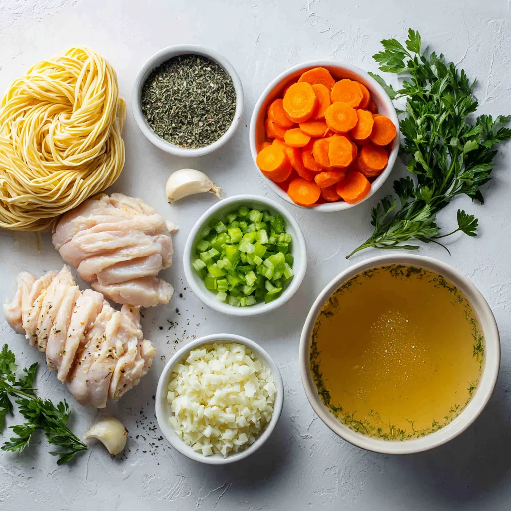 These items form the heart of the soup. The chicken gives it protein. The broth adds depth. Carrots and celery bring sweetness and crunch. Onion and garlic provide a nice base flavor.