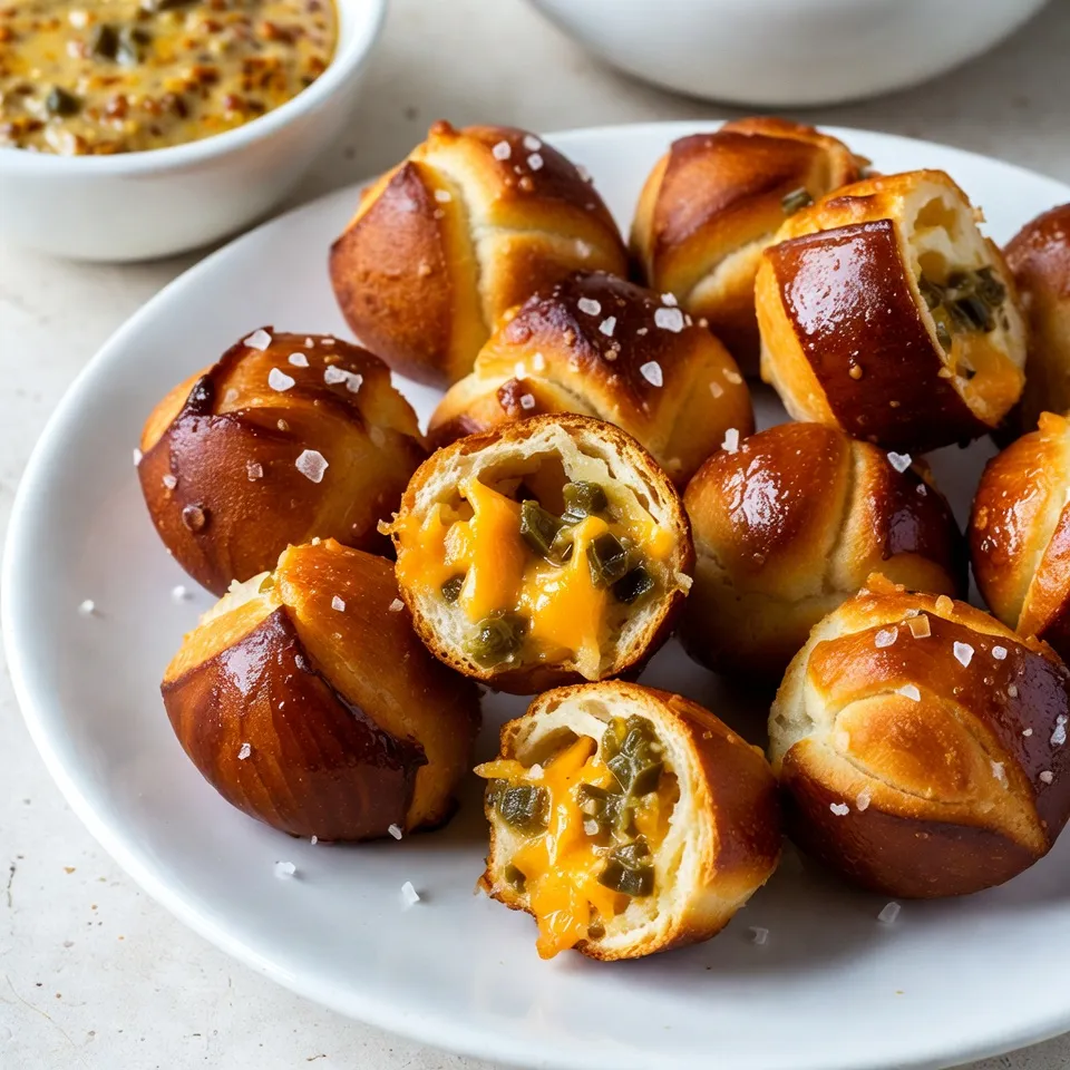 Delicious bite-sized pretzels filled with sharp cheddar cheese and jalapeños, perfect for snacking.